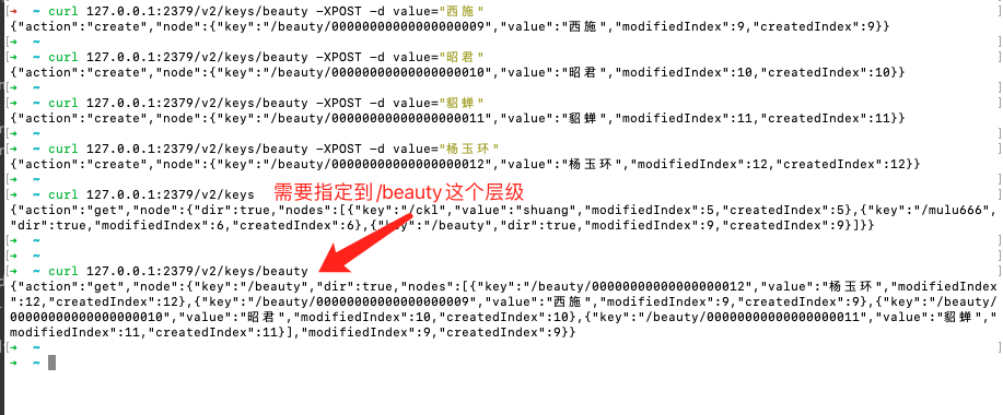 1 | curl 127.0.0.1:2379/v2/keys/beauty -XPOST -d value="西施" |