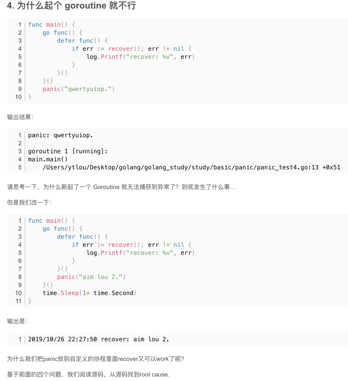 go func() { defer func() { if err := recover(); err != nil { fmt.Println("recover err:", err) } }() panic("里面出错了") }()