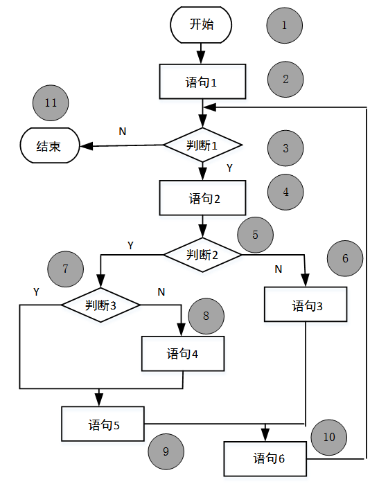 (3)流图G的环形复杂度V(G)=P+1,其中,P是流图中判定结点的数目。