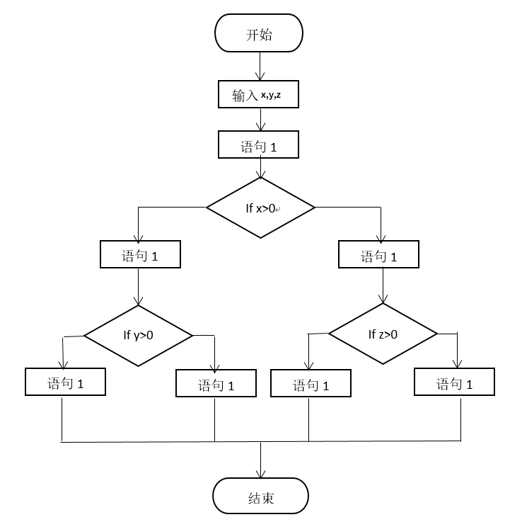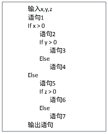 对于本题,用例(x,y,z)分别为(1,1,0)(1,-1,0)(-1,0,1)(-1,0,-1),这4个测试用例可以走完所有可能路径。因为在伪代码中,我们可以看到,当x>0时,只需要对Y分别取大于0和不大于0的值即可,z不参与比较;当x不大于0时,只需要对z分别取大于0和不大于0的值即可,y不参与比较,只需要4个用例即可。