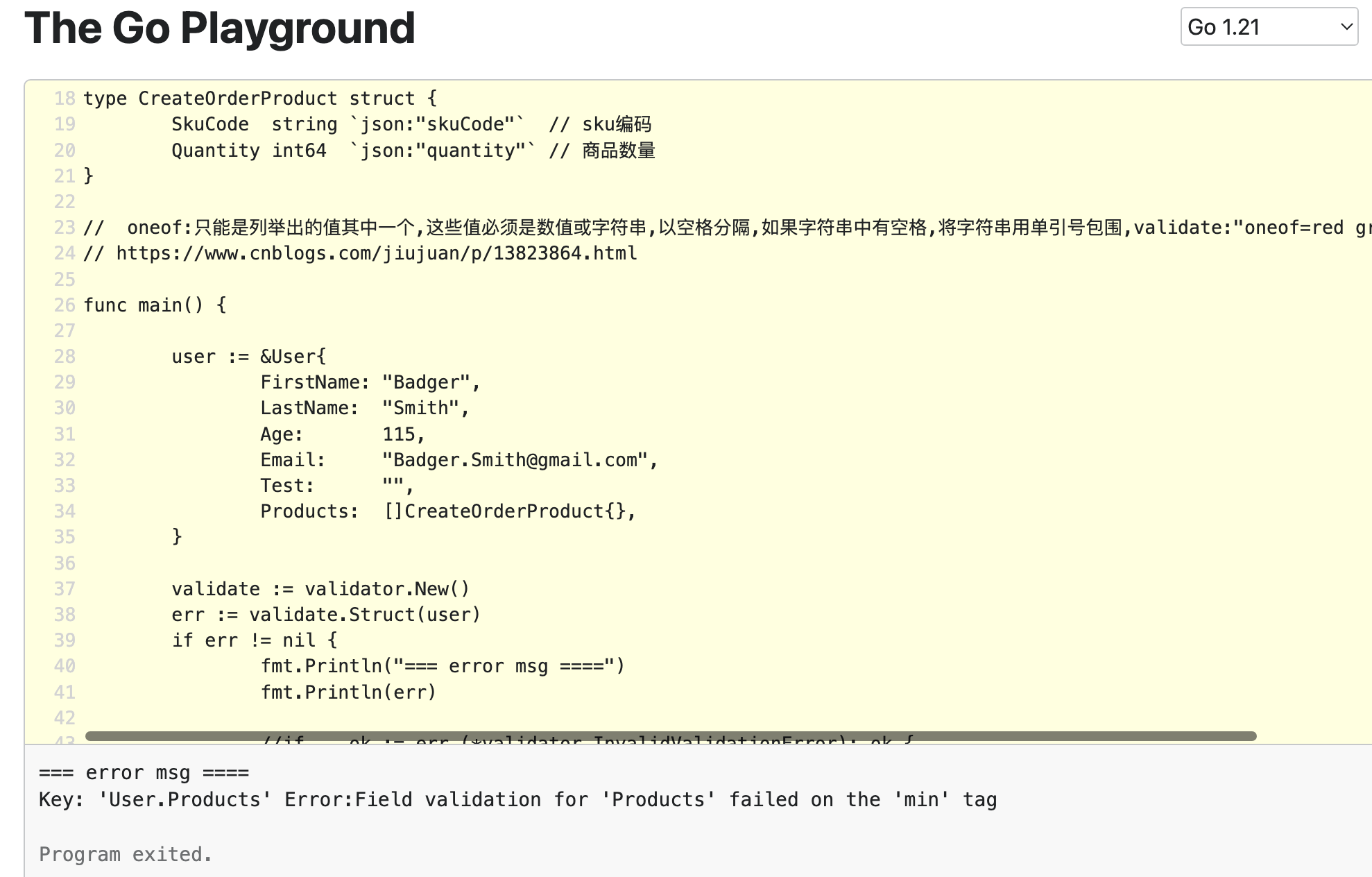 1 2 3 4 5 6 7 8 9 10 11 12 13 14 15 16 17 18 19 20 21 22 23 24 25 26 27 28 29 30 31 32 33 34 35 36 37 38 39 40 41 42 43 44 45 46 47 48 49 50 51 52 53 54 55 56 57 58 59 60 61 62 63 64 65 66 67 68 package mainimport ( "fmt" "github.com/go-playground/validator/v10" ) type User struct { FirstName string `validate:"required"` LastName string `validate:"required"` Age uint8 `validate:"gte=0,lte=130"` Email string `validate:"required,email"` Test string `validate:"len=0|min=6,max=24,len=0|alphanum"` Products []CreateOrderProduct `validate:"min=1"` } type CreateOrderProduct struct { SkuCode string `json:"skuCode"` Quantity int64 `json:"quantity"` } func main () { user := &User{ FirstName: "Badger" , LastName: "Smith" , Age: 115 , Email: "Badger.Smith@gmail.com" , Test: "" , Products: []CreateOrderProduct{}, } validate := validator.New() err := validate.Struct(user) if err != nil { fmt.Println("=== error msg ====" ) fmt.Println(err) return } }