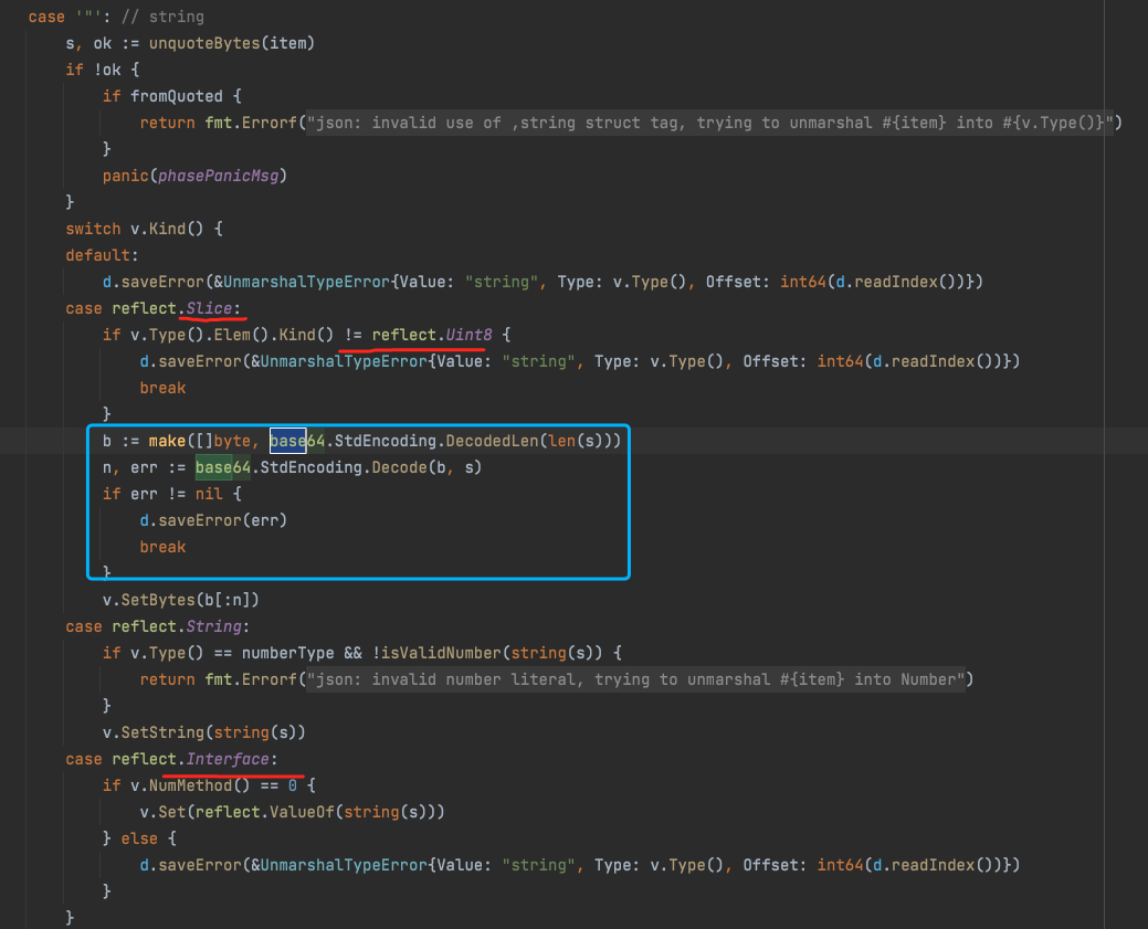 在 json.Unmarshal时也有类似反向处理,src/encoding/json/decode.go: