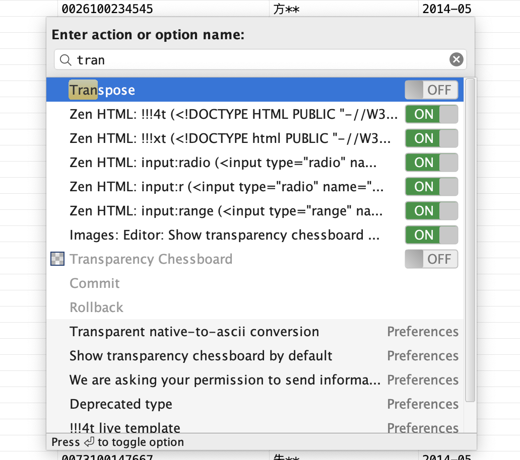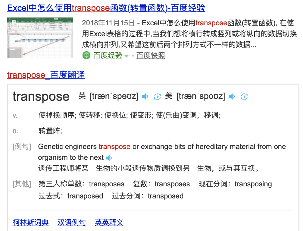 输入transpose并选择, 则行列将倒换,