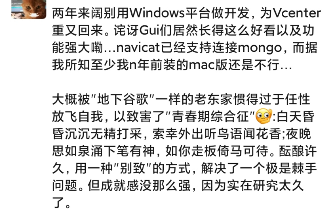 此番如李元芳”弃刀用剑”,只是工具的改变,本无大碍. 但翻看了下朋友圈”Navicat”关键词相关状态,还是有些小小感叹.