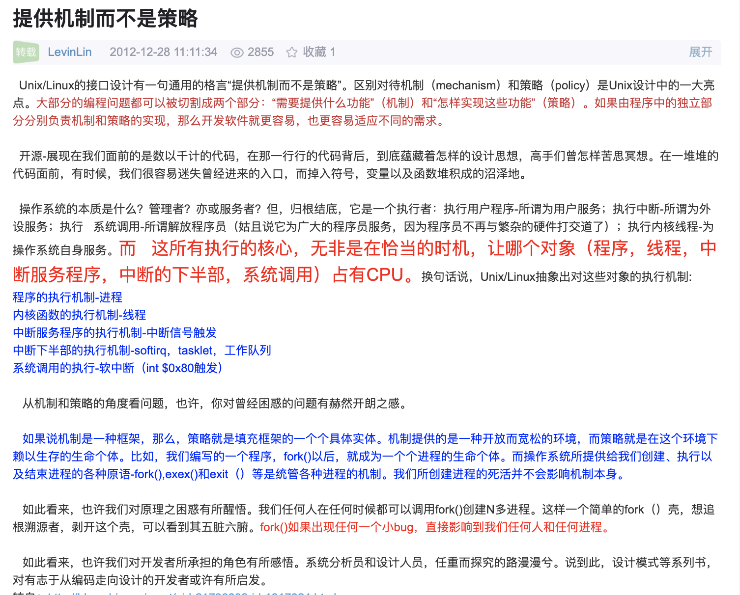 关于Unix/Linux的设计有一句通用的格言“提供机制而不是策略”。换句话说,系统调用抽象出了用于完成某种确定目的的函数。至干这些函数怎么用完全不需要内核去关心。区别对待机制(mechanism)和策略(policy)是Unix/Linux设计中的一大亮点。大部分的编程问题都可以被切割成两个部分:“需要提供什么功能”(机制)和“怎样实现这些功能”(策略)。