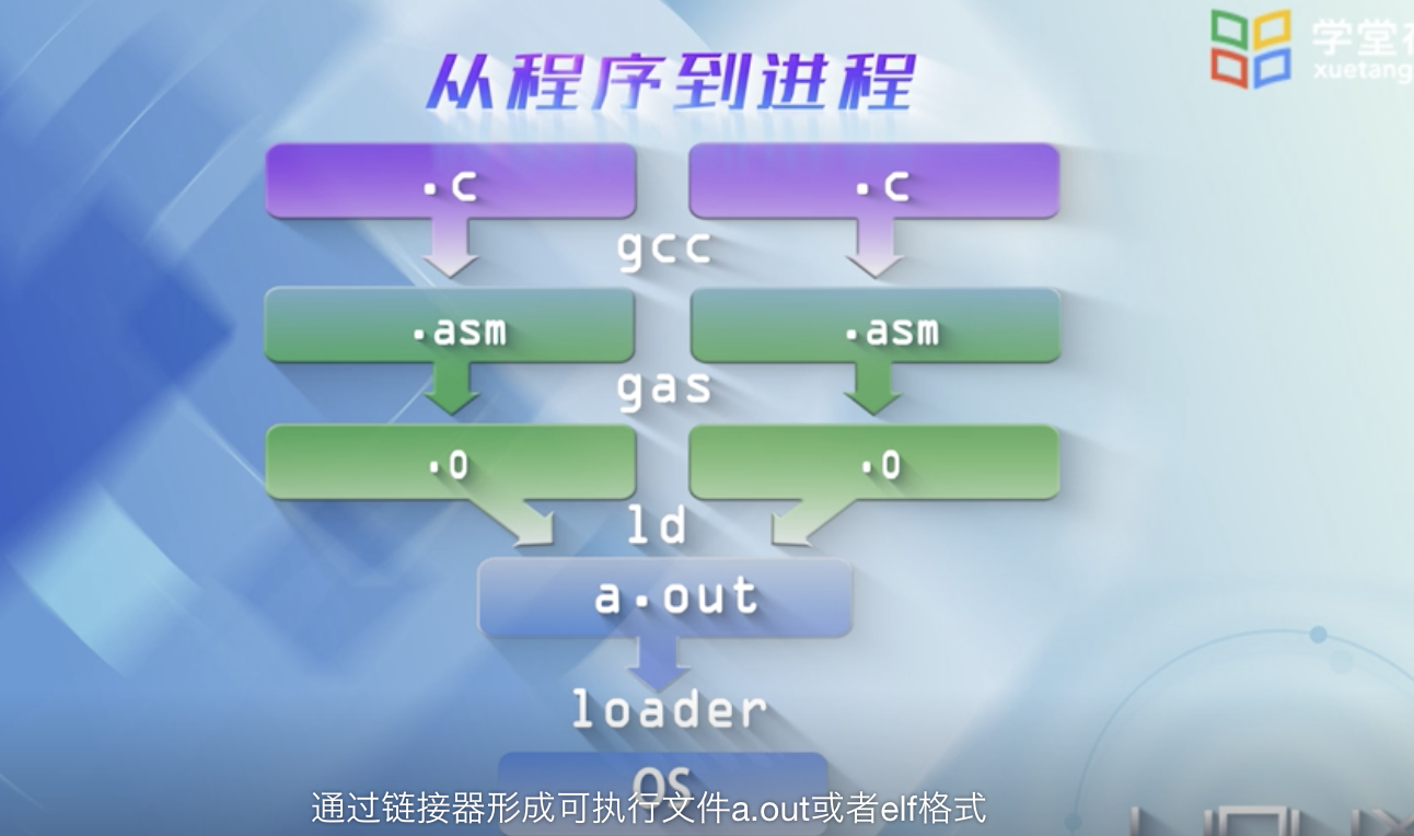 一个程序通过编译器将其编译成汇编程序,经过汇编器将其汇编成目标代码,通过链接器形成可执行文件a.out或者elf格式,最后交给操作系统来执行