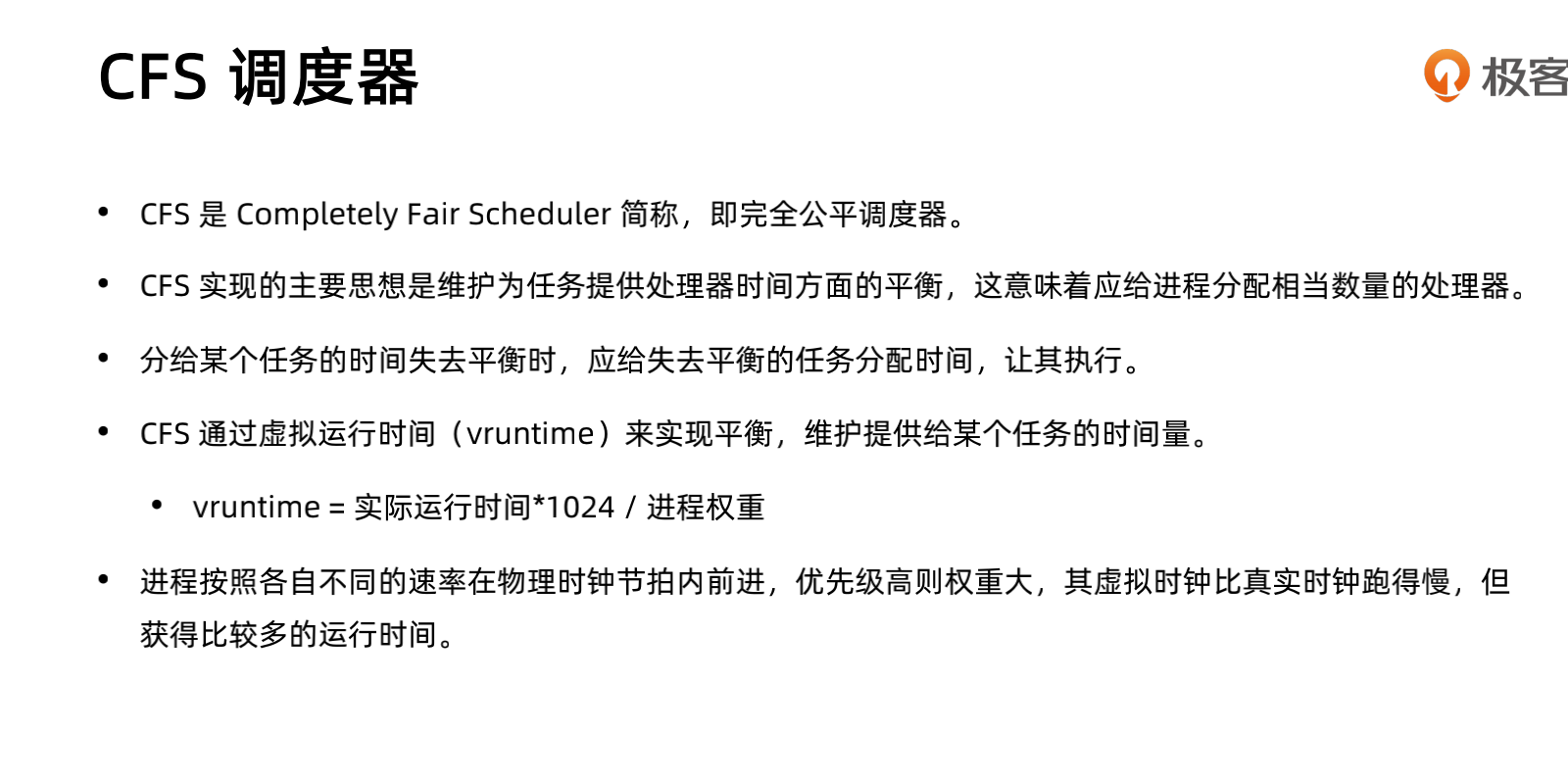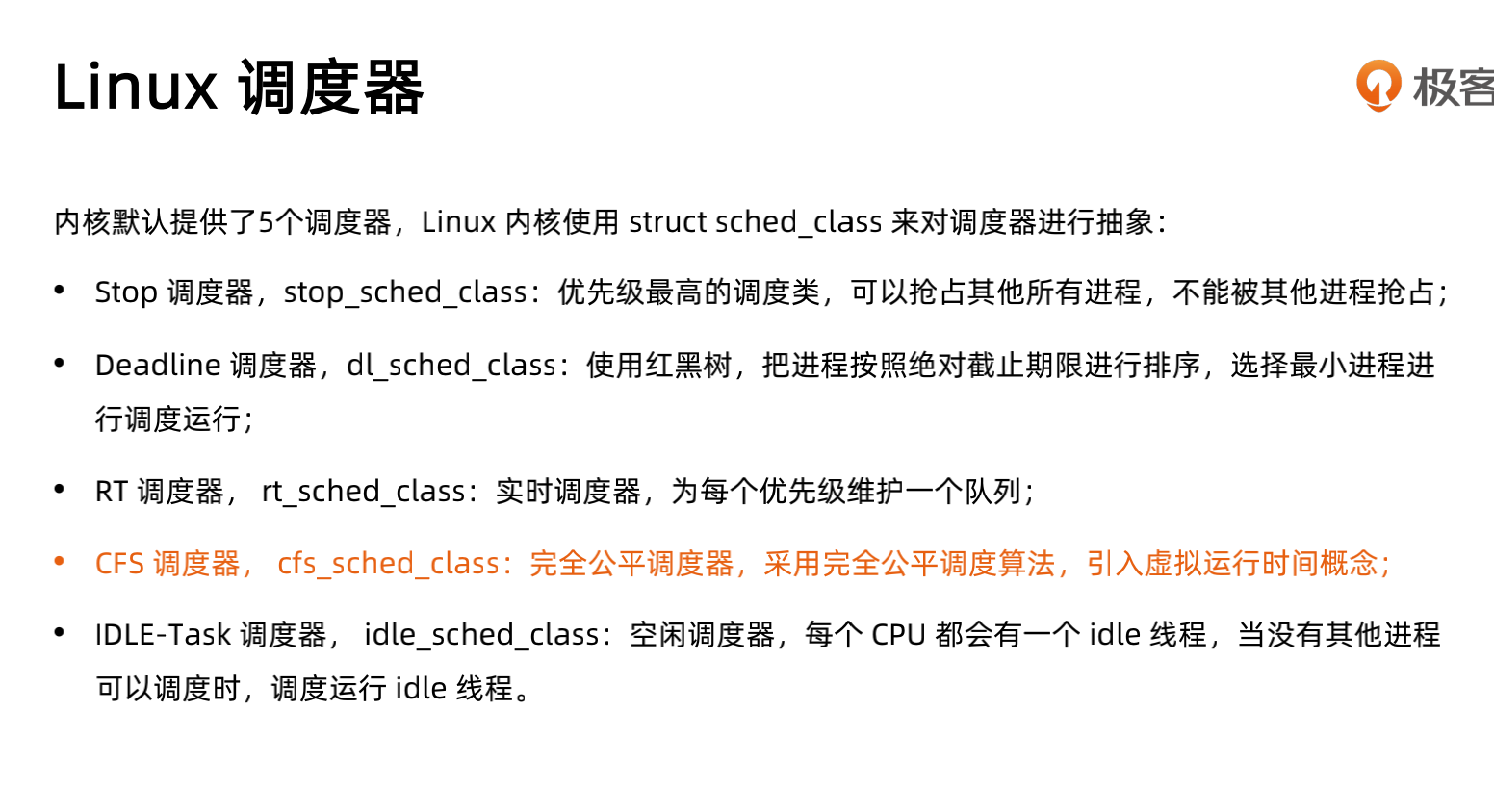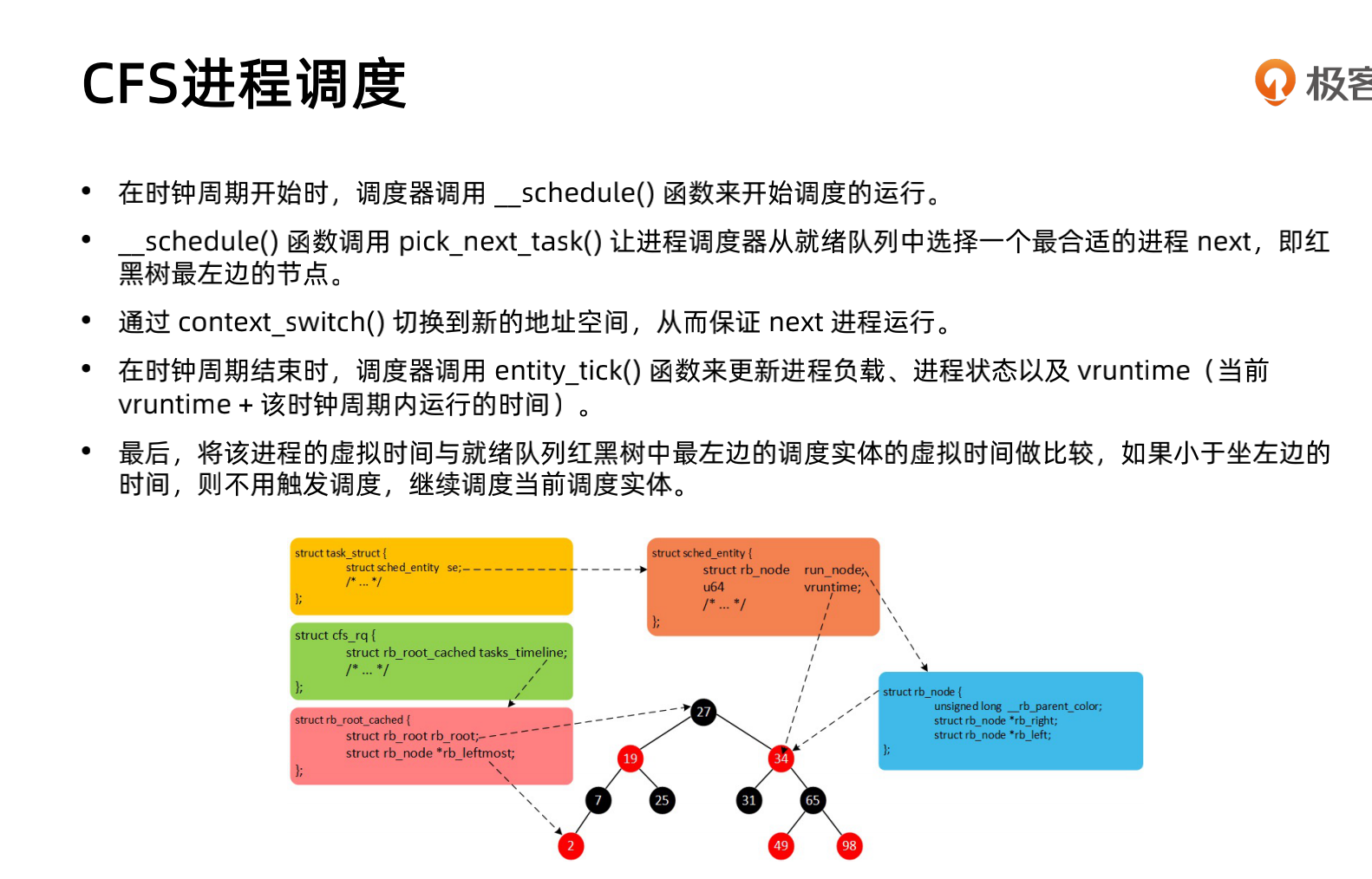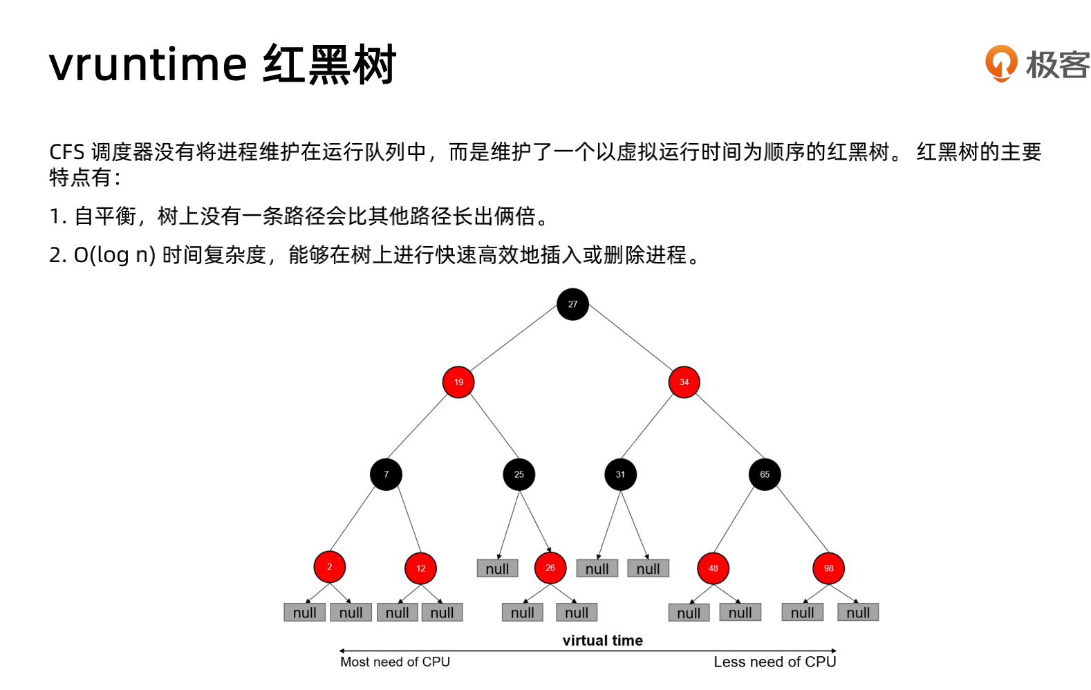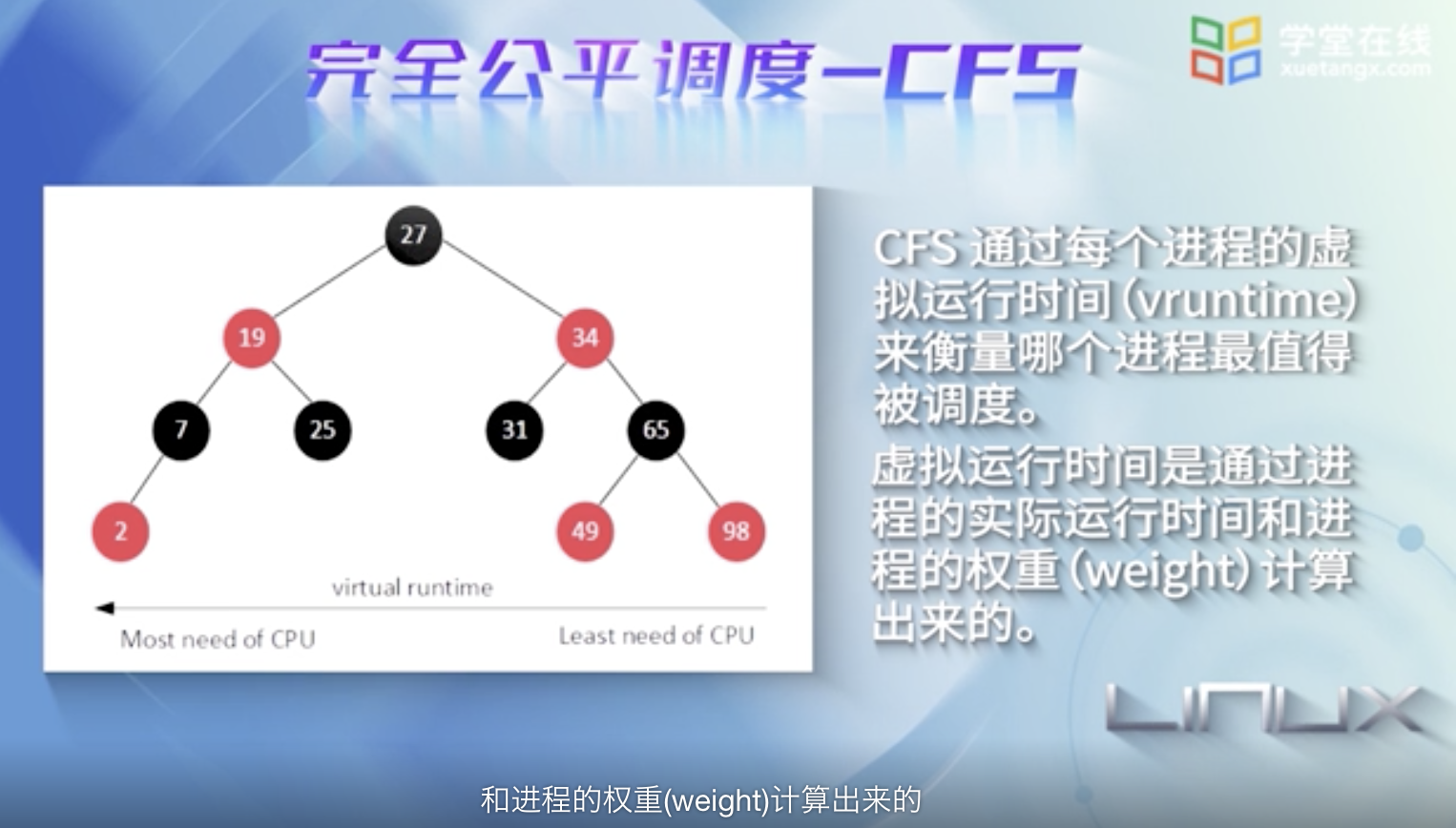 CFS中的就绪队列,就是一棵已虚拟时间为键值的红黑树, 虚拟时间越小的进程,越靠近红黑树的左端, 调度器每次选择位于红黑树左端的进程.