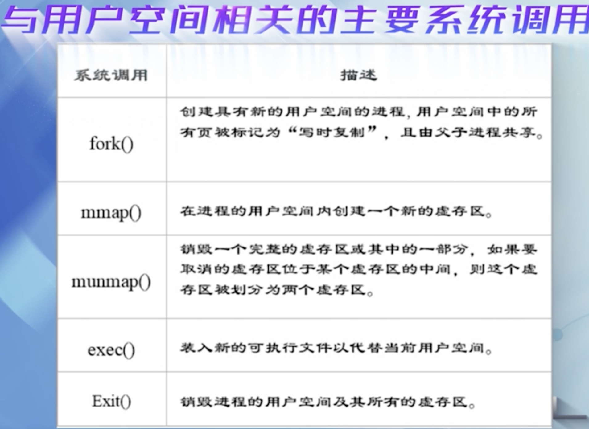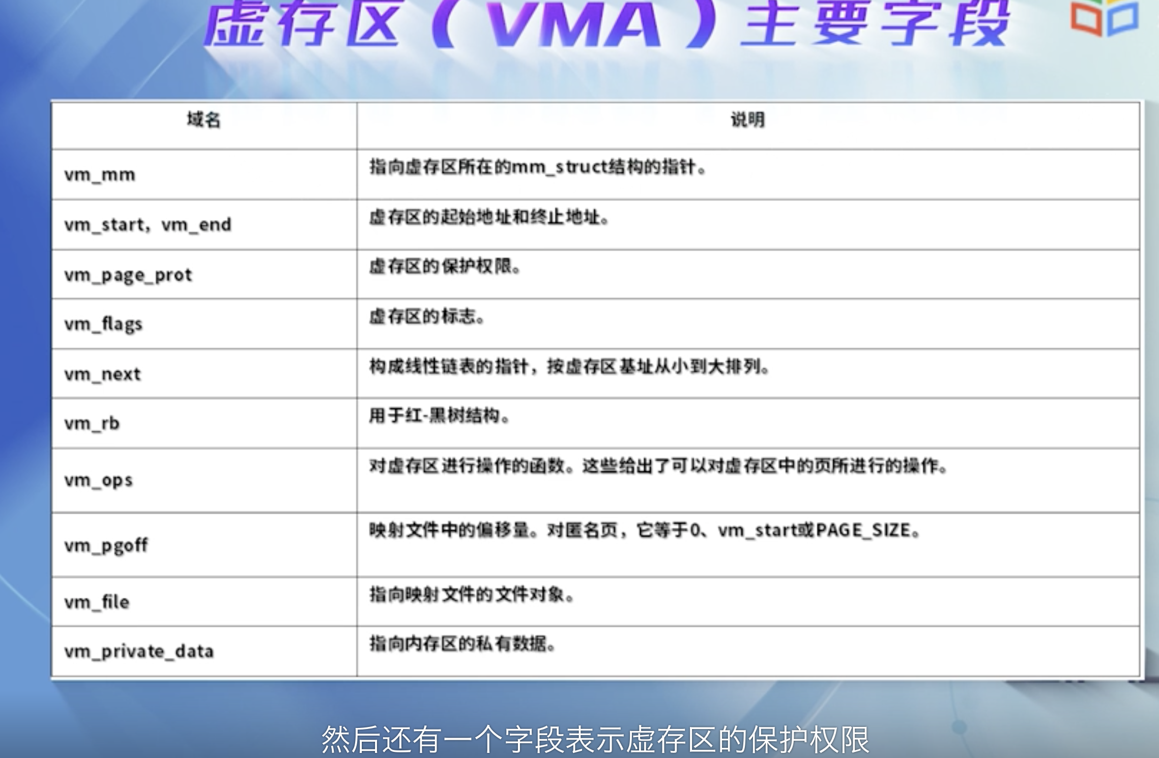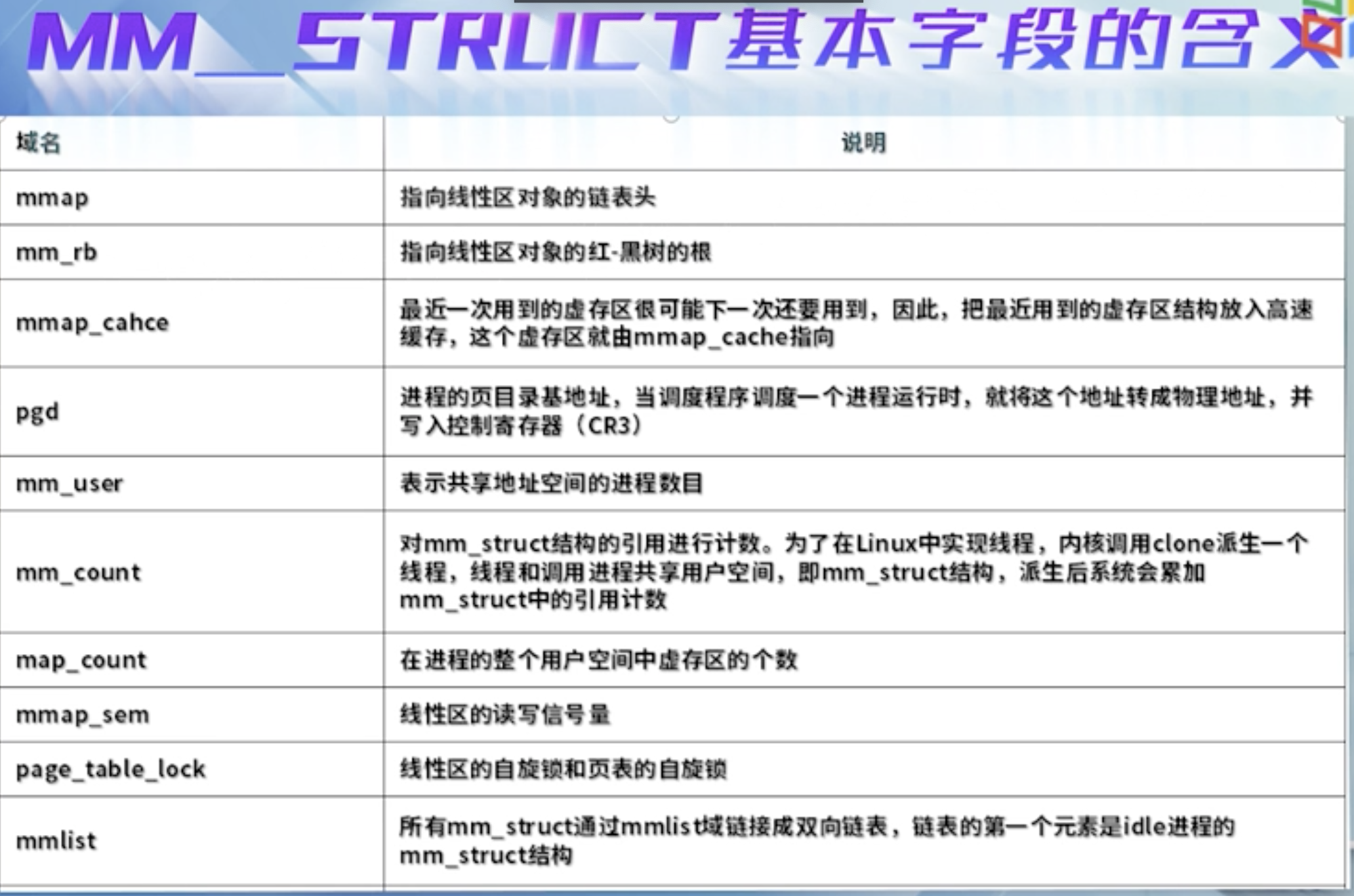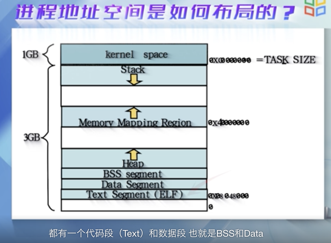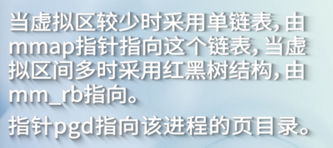 一个进程的用户地址空间由两个数据结构来描述, mm_struct和 vma_area_struct ,前者对进程整个用户空间进行描述,后者对用户空间的各个内存区进行描述