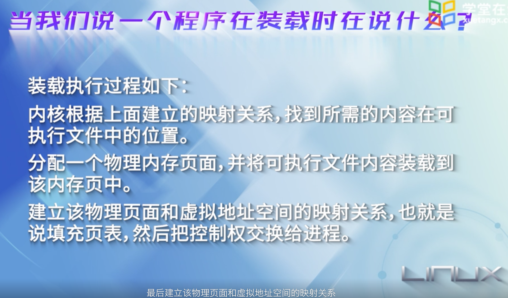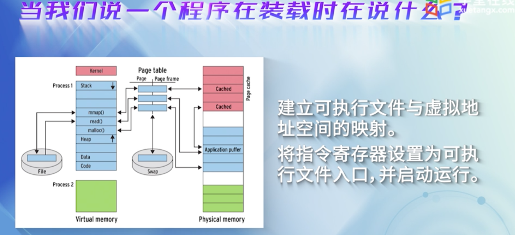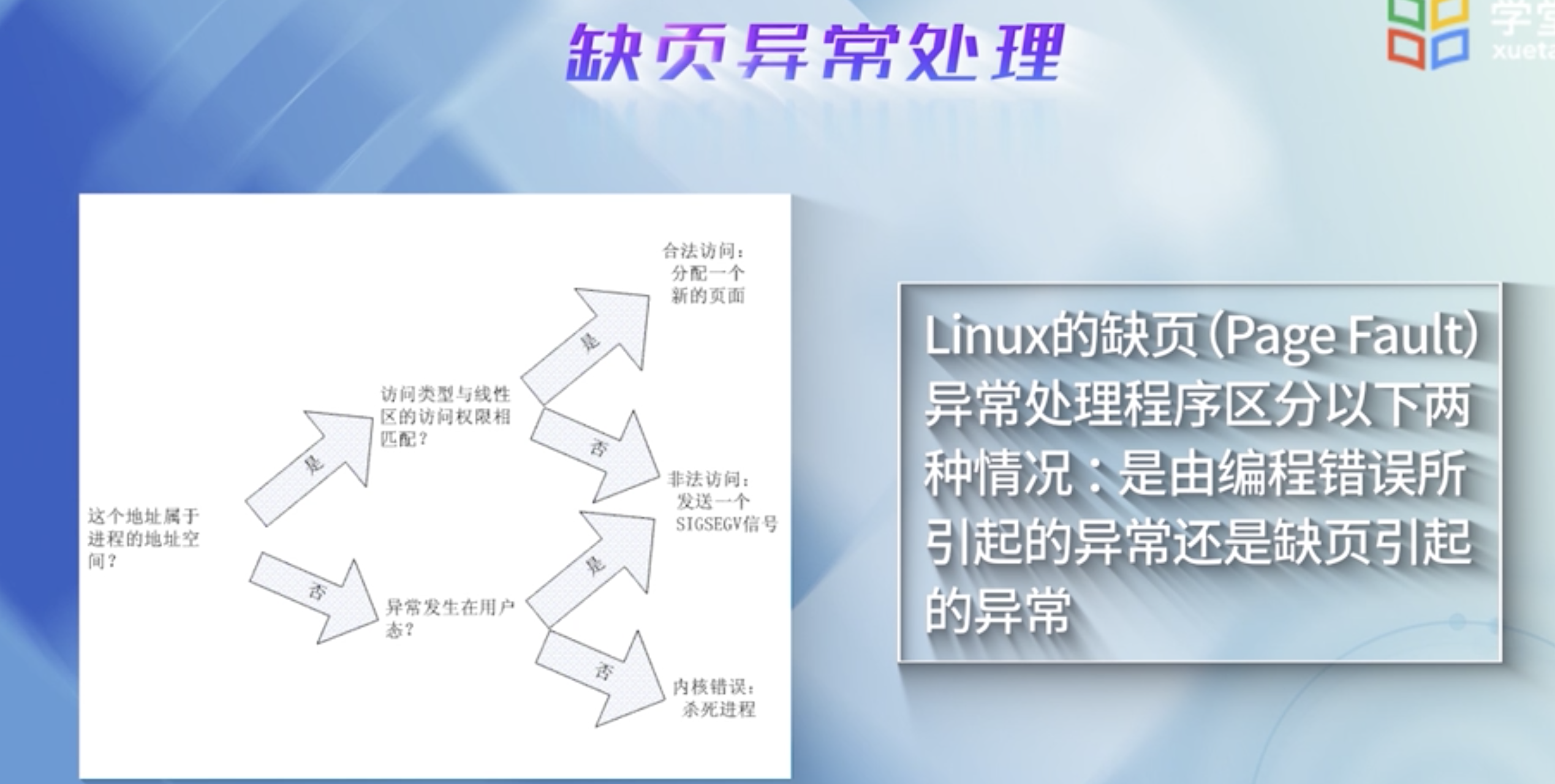 当一个进程运行的时候,CPU访问的是用户空间的虚地址, Linux仅把当前要使用的少量页面装入到内存, 需要时通过请页机制将特定的页面调入到内存;当访问的页不在内存时,就产生一个页故障,并报告故障的原因.