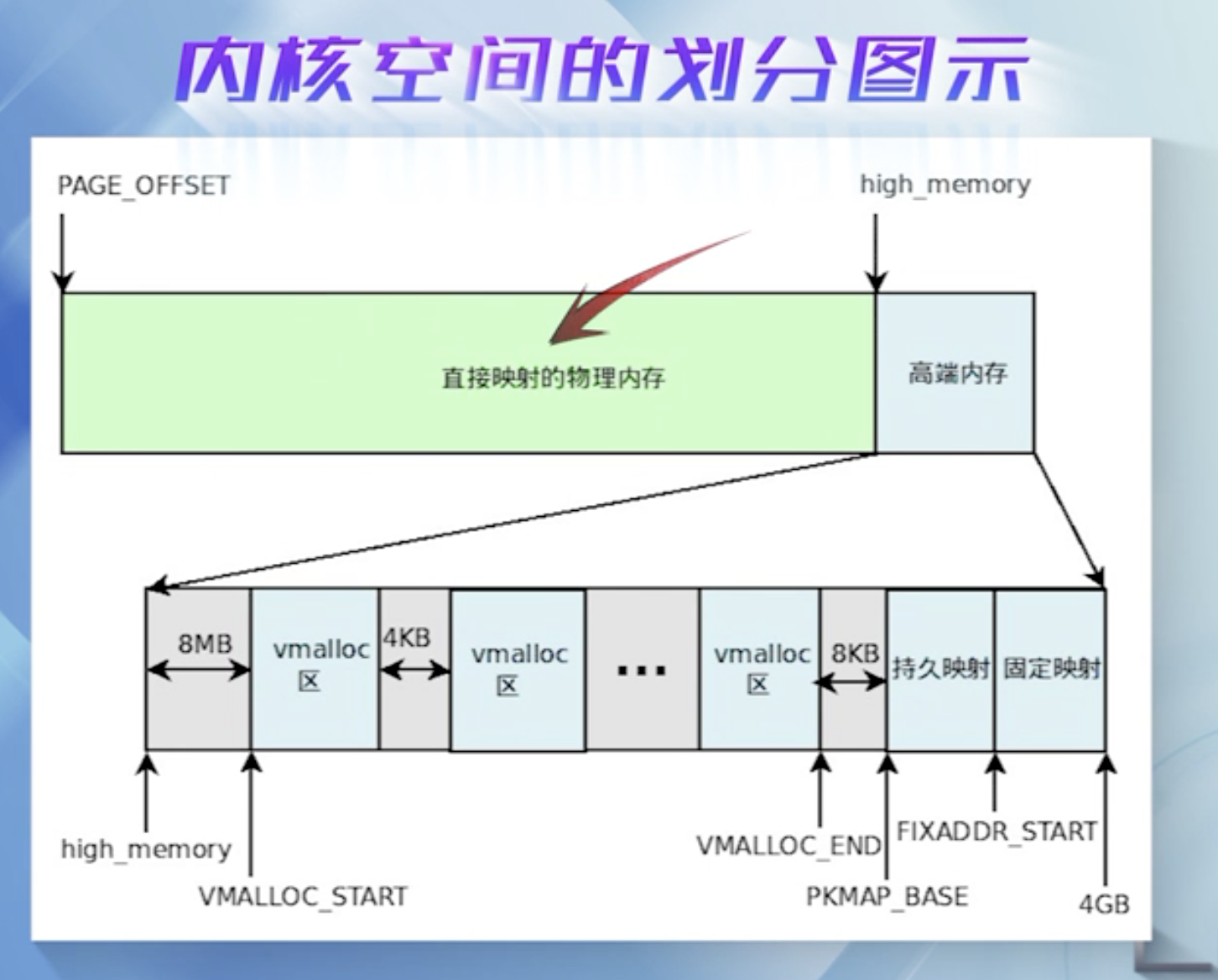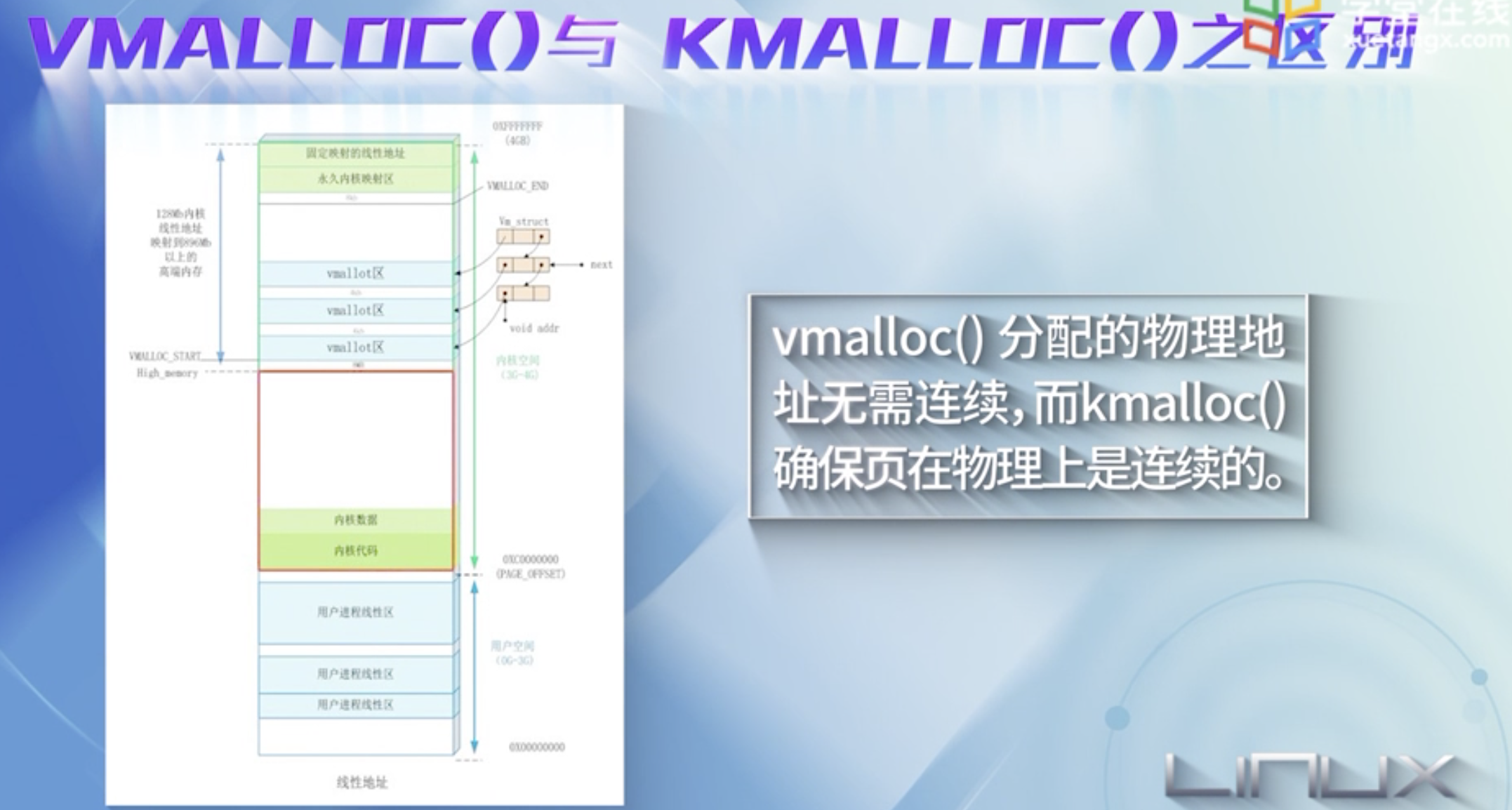 vmalloc机制: 使得内核通过连续的线性地址来访问非连续的物理页框,这样可以最大限度的使用高端物理内存.