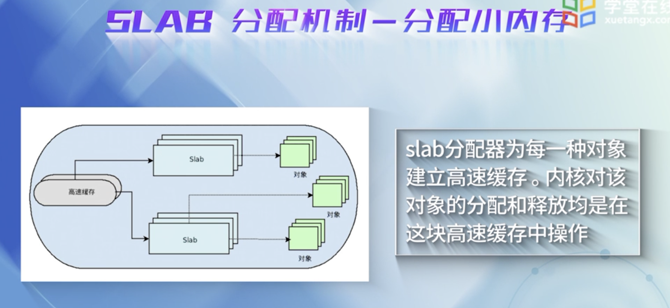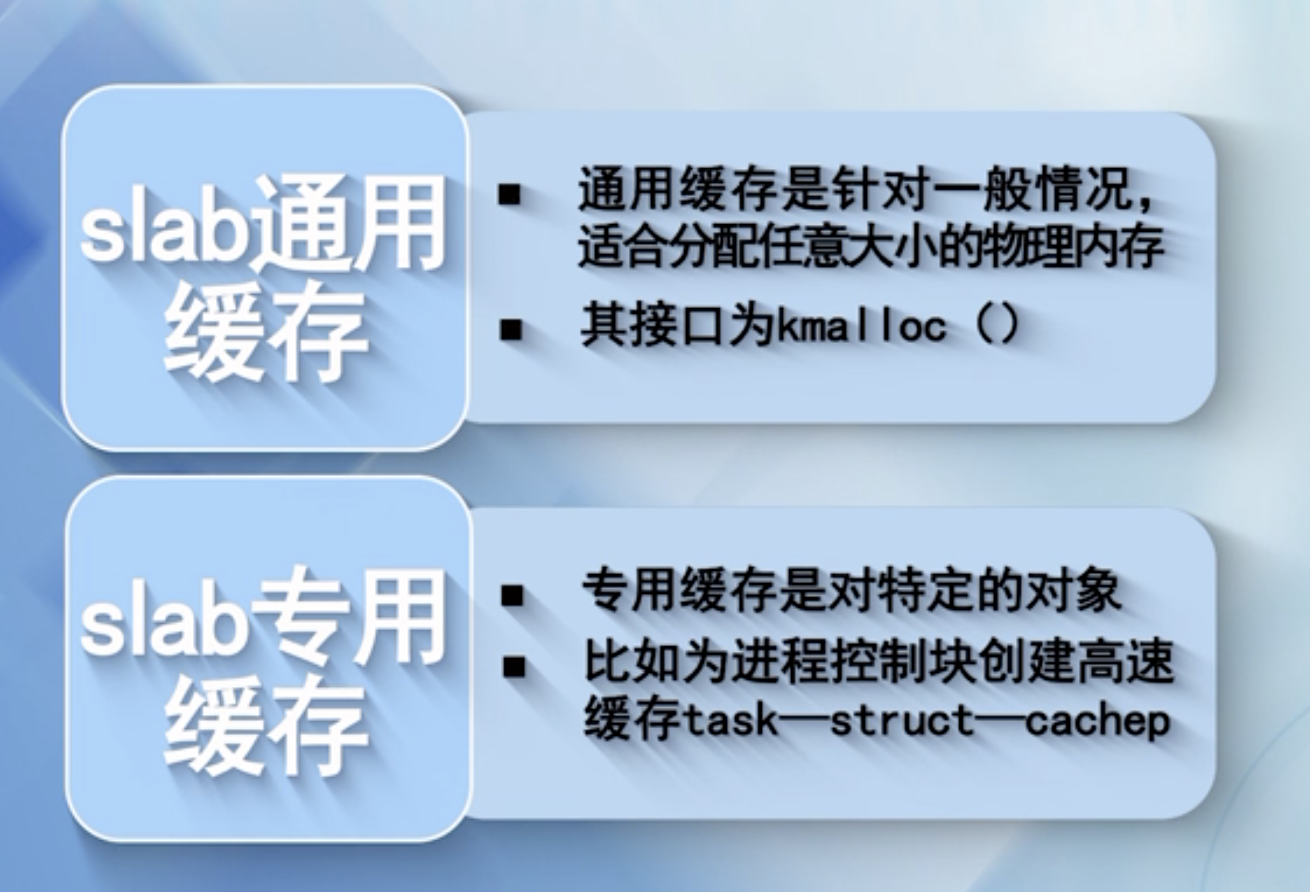 slab缓存: 服务小块物理内存的分配,并且它也作为高速缓存,主要针对内核中经常分配并释放的对象.