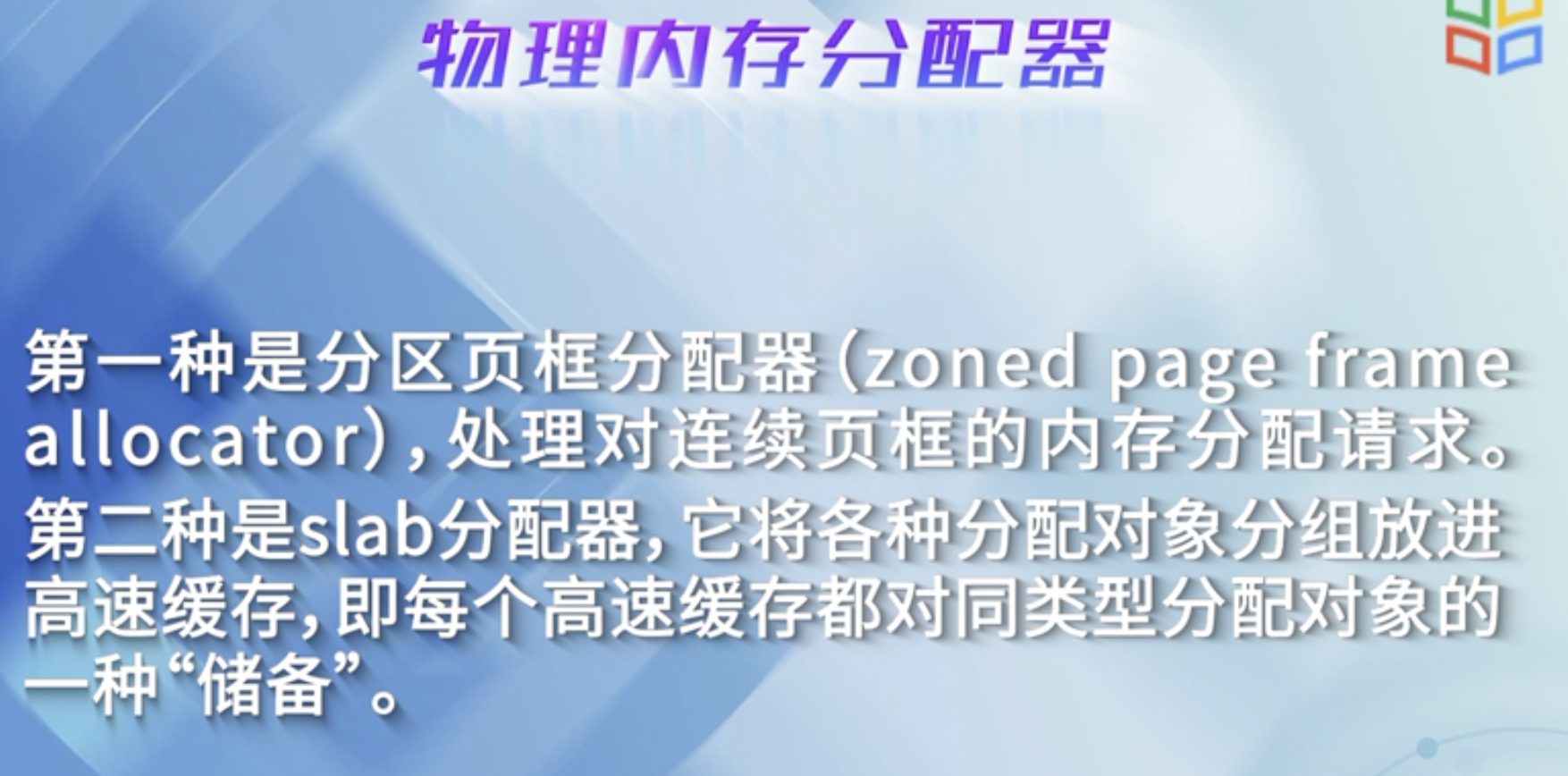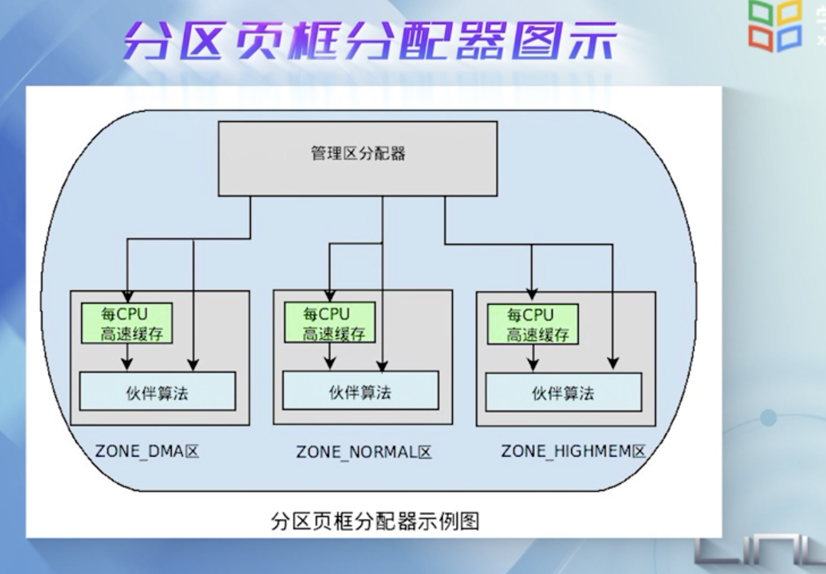 per-CPU页框高速缓存: 内核经常请求和释放单个页框,该缓存包含预先分配的页框,用于满足本地CPU发出的单一页框请求.