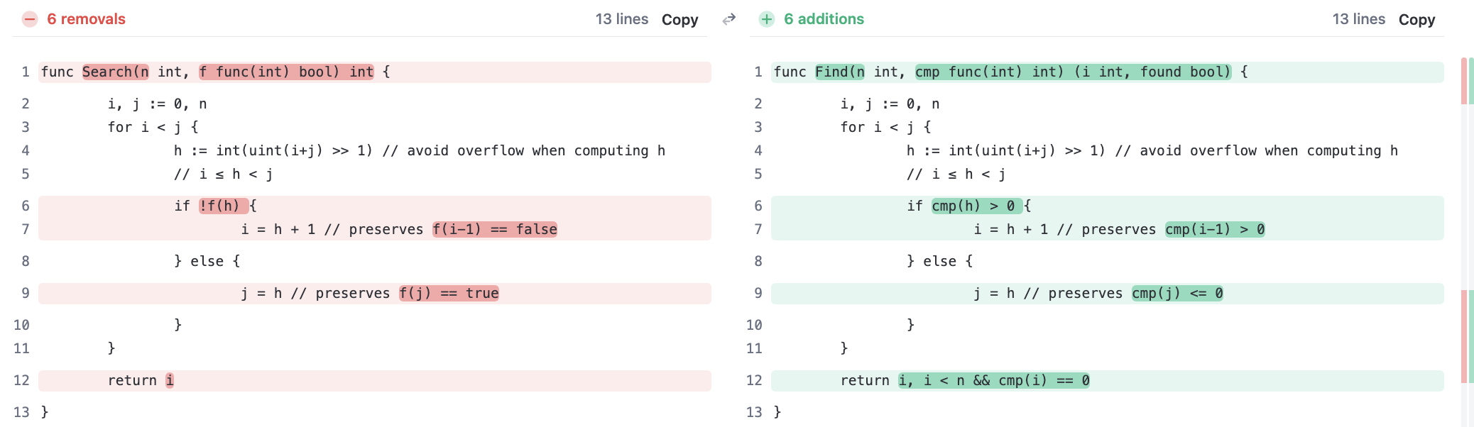 sort.Search() 提交于遥远的2010年11月11日,提交者是Go三位创始人之一的Robert Griesemer, 随Go第一个正式版本一起发布