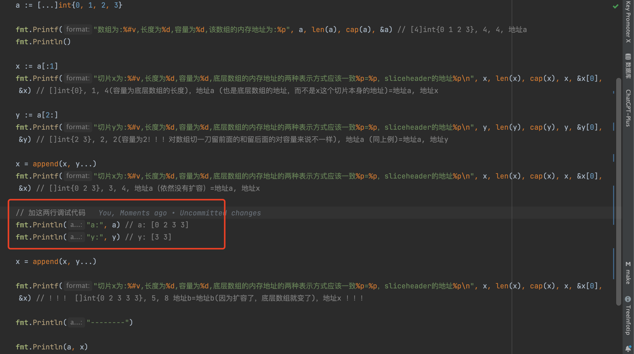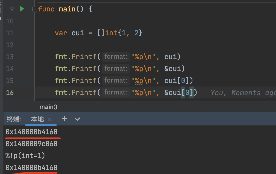 1 | 数组为:[4]int{0, 1, 2, 3},长度为4,容量为4,该数组的内存地址为:0x140000280e0 |