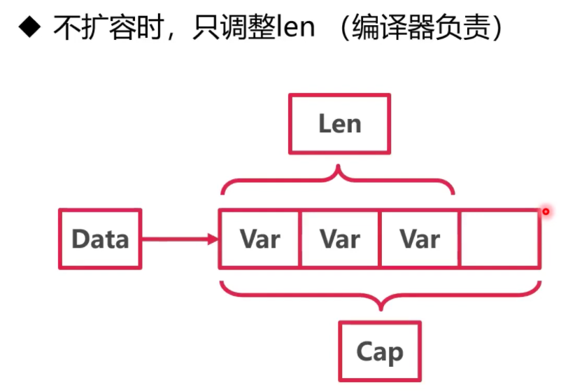 通过 append 操作,可以在 slice 末尾,额外新增一个元素. 需要注意,这里的末尾指的是针对 slice 的长度 len 而言. 这个过程中倘若发现 slice 的剩余容量已经不足了,则会对 slice 进行扩容
