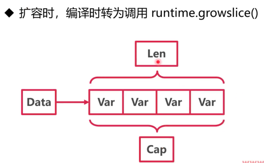 当 slice 当前的长度 len 与容量 cap 相等时,下一次 append 操作就会引发一次切片扩容
