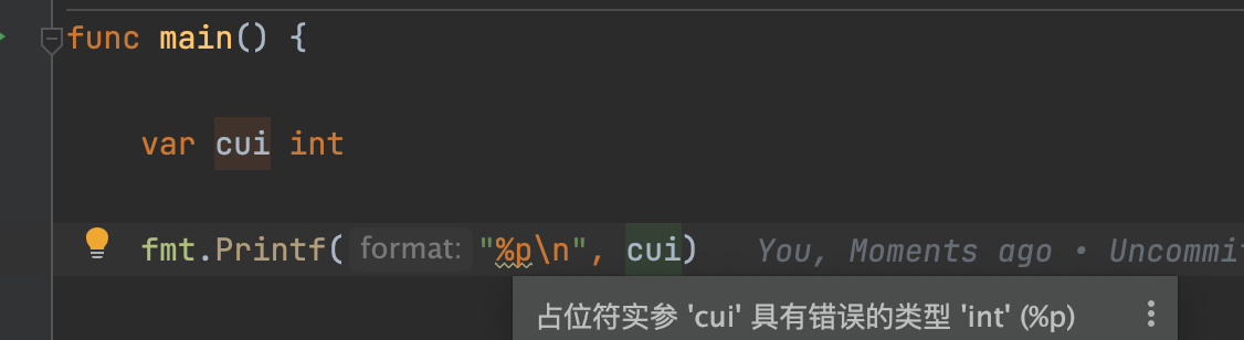 后面的参数必须为 指针类型,否则IDE会有提示,运行后打出来的是%!p(int=0)