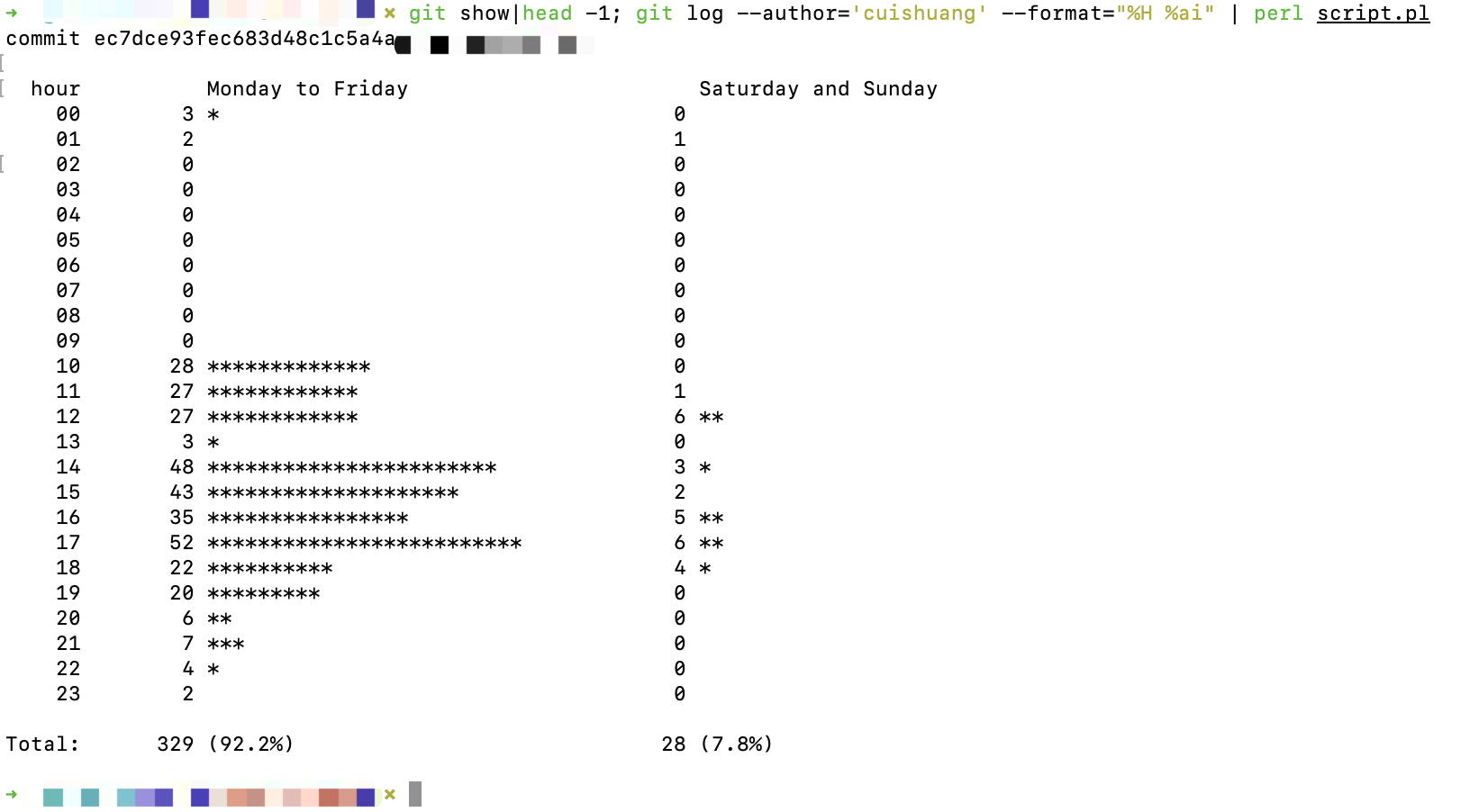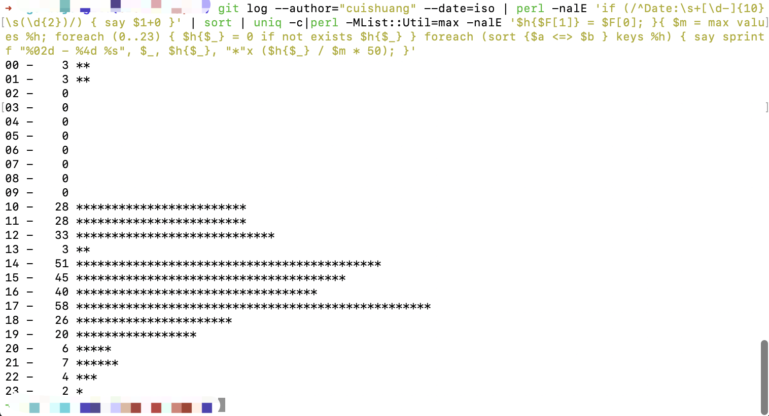 git log --author="某个username" --date=iso | perl -nalE 'if (/^Date:\s+[\d-]{10}\s(\d{2})/) { say $1+0 }' | sort | uniq -c|perl -MList::Util=max -nalE '$h{$F[1]} = $F[0]; }{ $m = max values %h; foreach (0..23) { $h{$_} = 0 if not exists $h{$_} } foreach (sort {$a <=> $b } keys %h) { say sprintf "%02d - %4d %s", $_, $h{$_}, "*"x ($h{$_} / $m * 50); }'