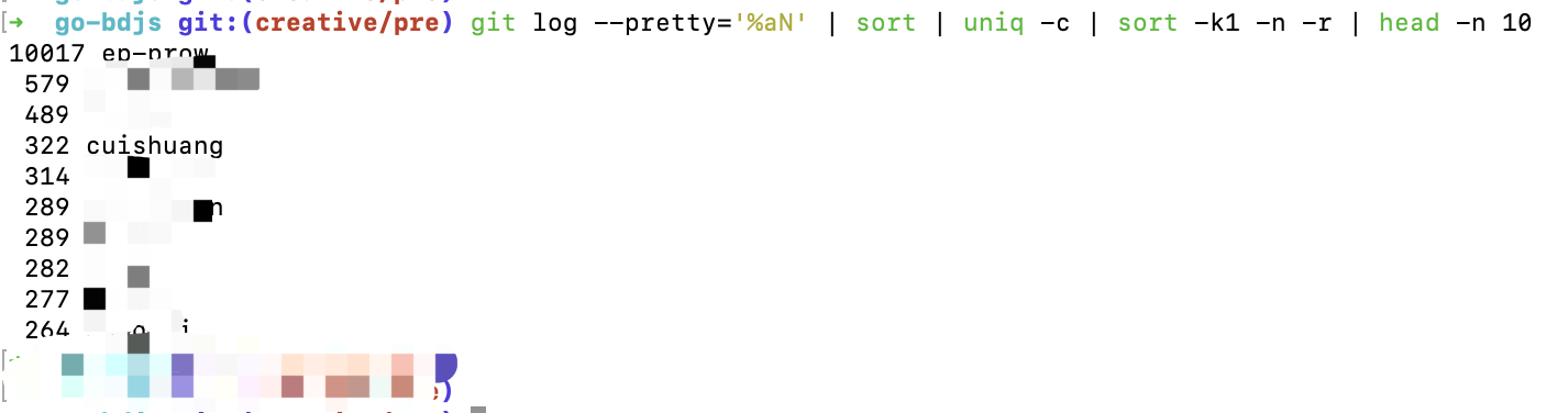 git log --pretty='%aN' | sort | uniq -c | sort -k1 -n -r | head -n 10