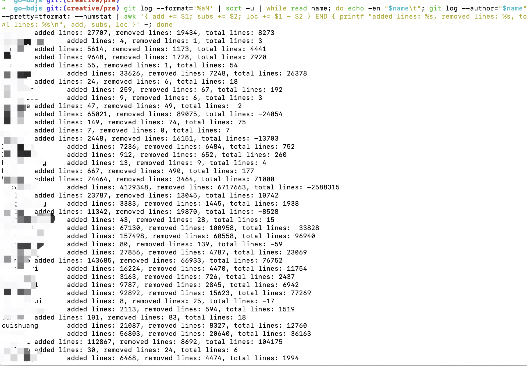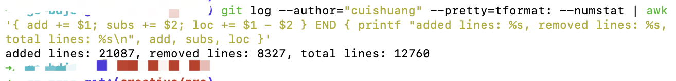 git log --author="cuishuang" --pretty=tformat: --numstat | awk '{ add += $1; subs += $2; loc += $1 - $2 } END { printf "added lines: %s, removed lines: %s, total lines: %s\n", add, subs, loc }'