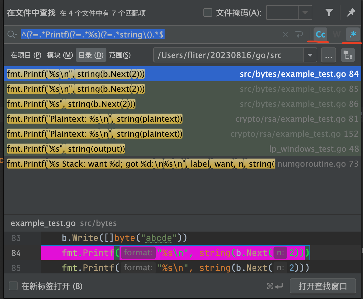 这个表达式的整体含义是,只有当一行的文本同时包含 “Printf”,”%s”,和 “string(“ 这三个字符串时,才会被匹配。