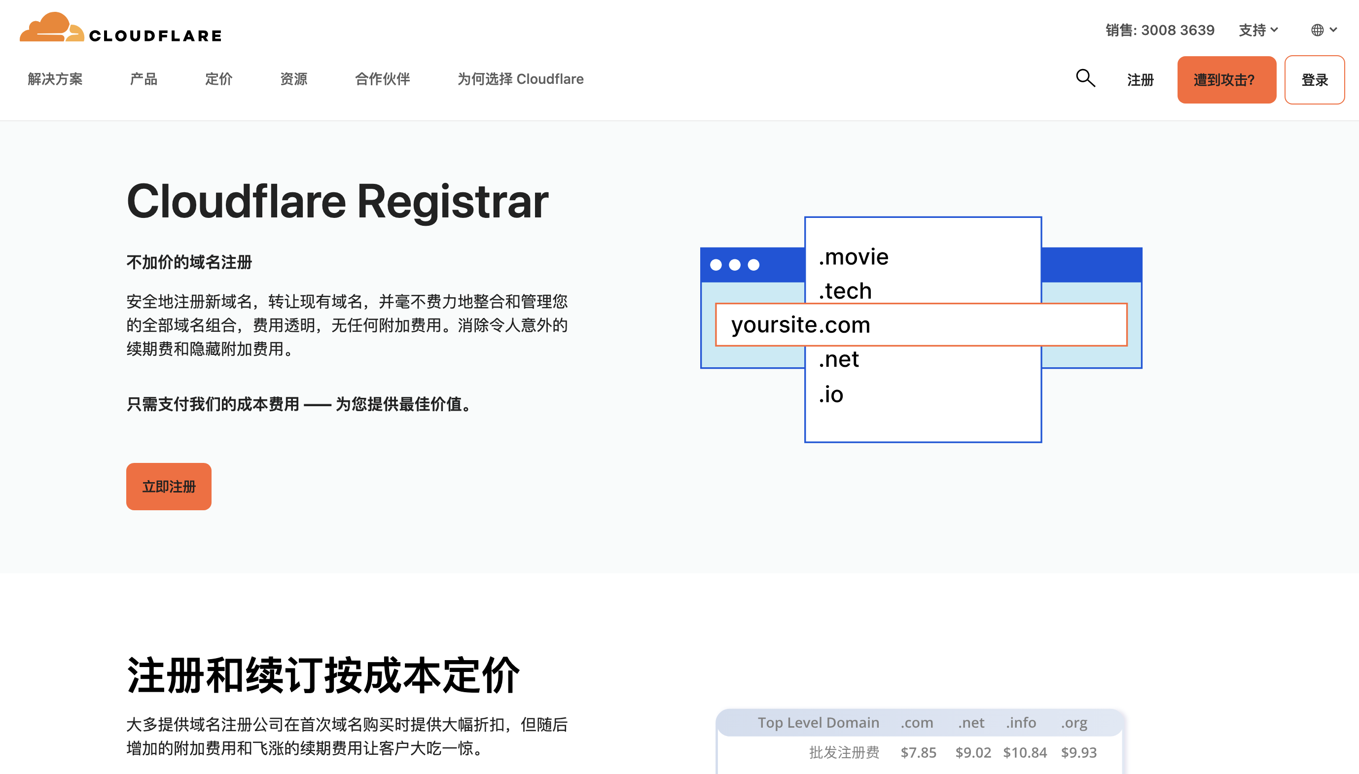 Cloudflare Registrar 是一个域名注册服务商,提供域名注册、域名续费等服务,支持顶级域名如.com、.net、.org等以及数百个其他域名[1][2][4]。使用 Cloudflare 注册域名还可以直接享受其免费的 CDN 服务,并且费用透明,不会有额外的附加费用[3][5]。Cloudflare Registrar 致力于支持各种可用的顶级域名,但某些特定顶级域名可能会有额外的注册要求或法规[5]。该服务于2018年推出,承诺仅收取成本费用,不追求盈利[7]。通过 Cloudflare 注册域名,用户可以安全地管理域名,免除意外的续期费和隐藏费用[2][8]。