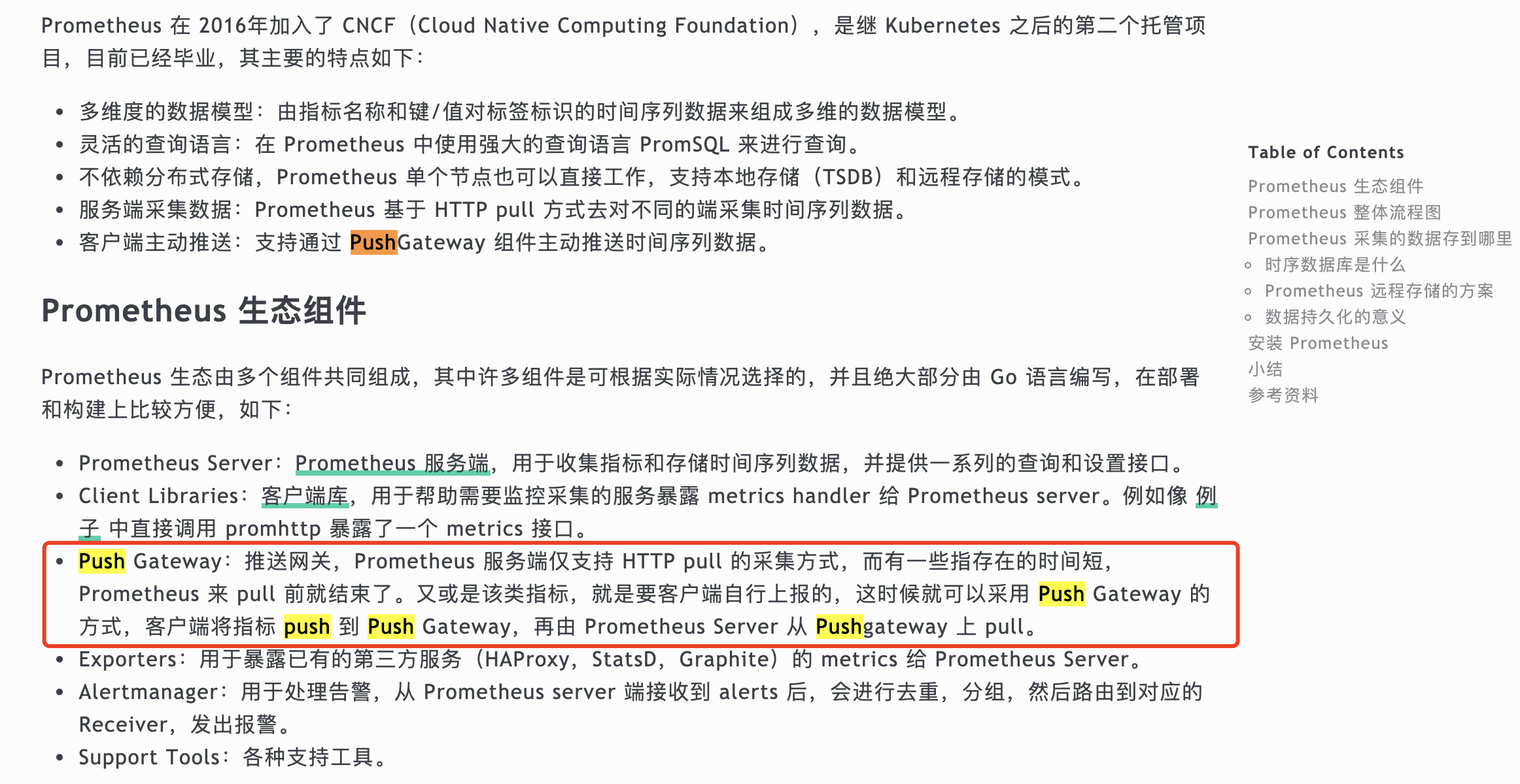 Prometheus是一个开源的监控系统,具有强大的查询语言和数据模型,用于收集和存储时间序列数据。Prometheus通过pull模型从被监控的目标(如服务器、容器等)中获取数据,然后将其存储在本地数据库中。Prometheus还提供了一种称为pushgateway的组件,用于允许被监控的目标通过push模型向Prometheus推送指标数据。