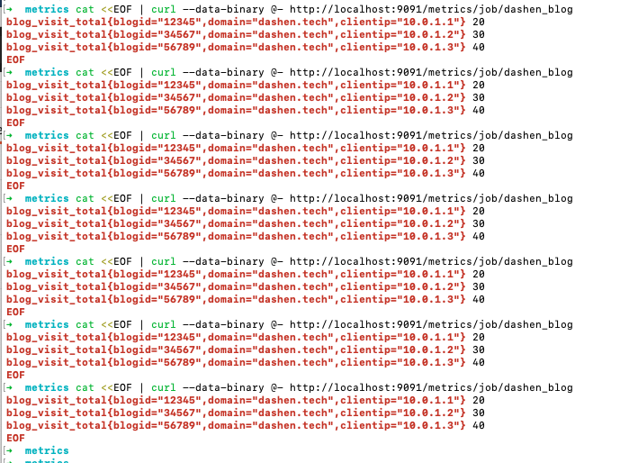 1 | cat <<EOF | curl --data-binary @- http://localhost:9091/metrics/job/dashen_blog |
