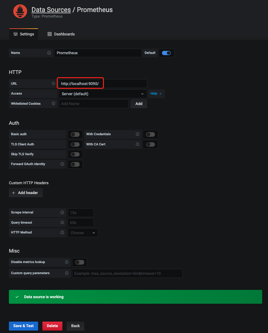 选择Prometheus数据源, 指定URL地址, 然后保存即可