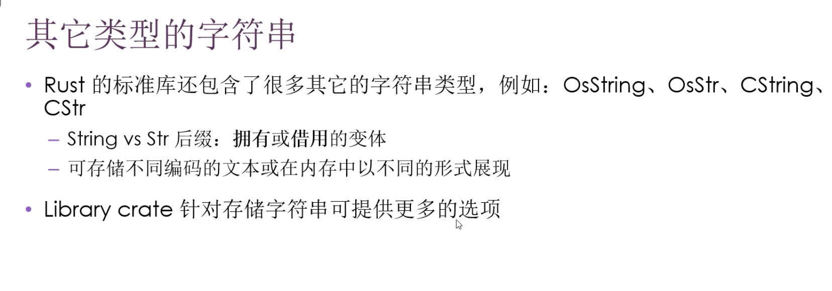 通过使用这些类型,Rust 提供了灵活且安全地处理不同类型的字符串和字符序列的功能,同时也支持与操作系统和 C 代码的交互。