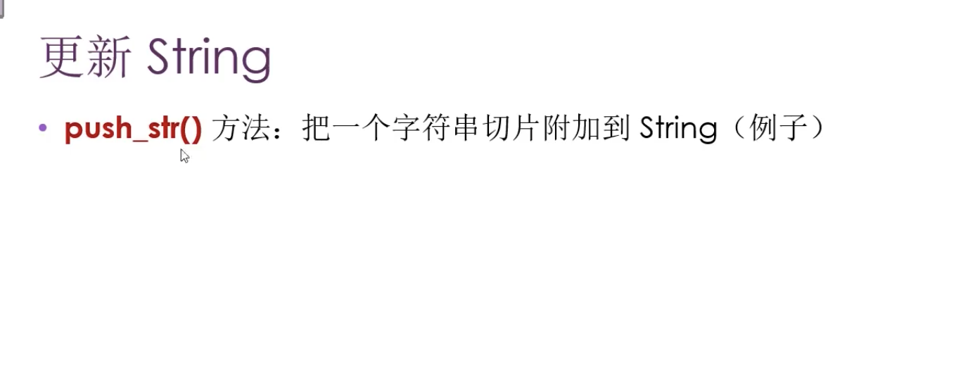 push_str方法在一个现有的String上追加另一个字符串。使用