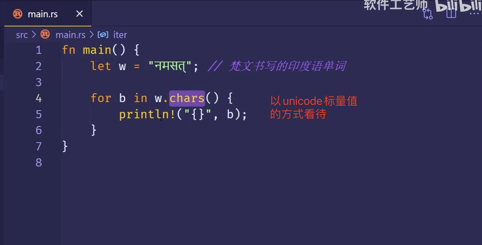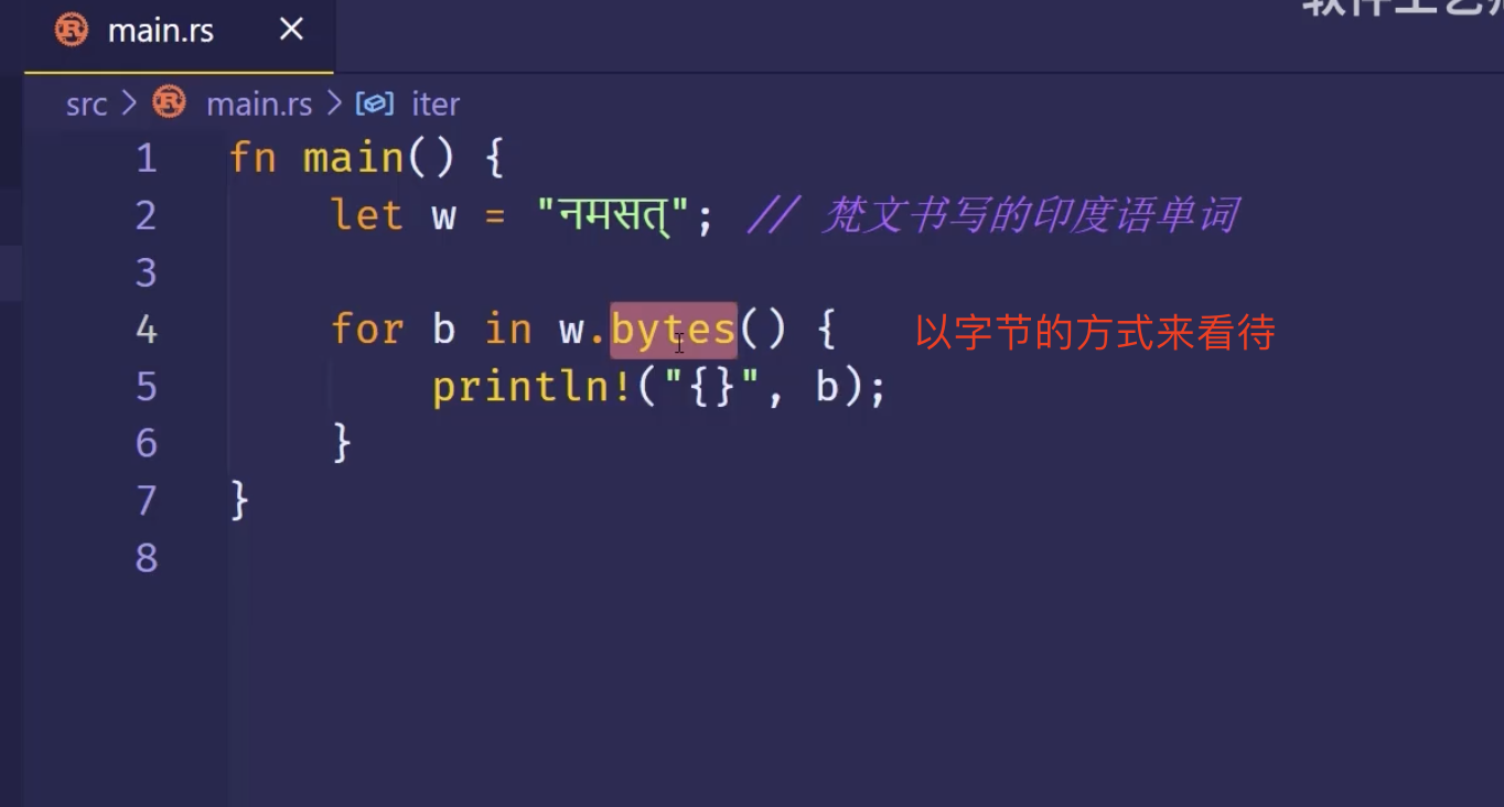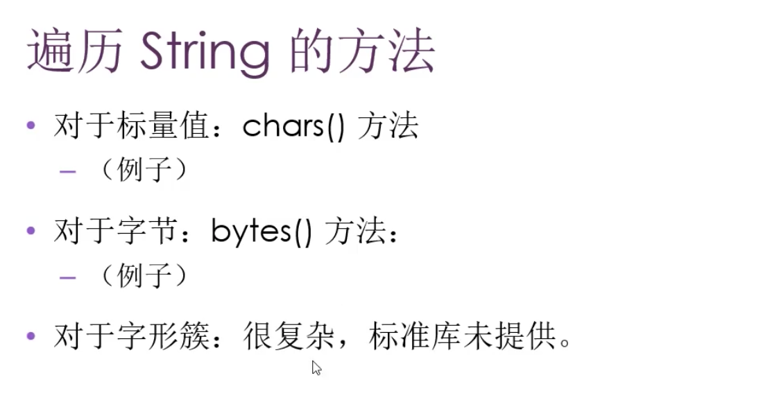 as_bytes()方法可以将字符串视为字节序列chars()方法可以遍历字符串的标量值graphemes()方法可以按字形集群切分字符串