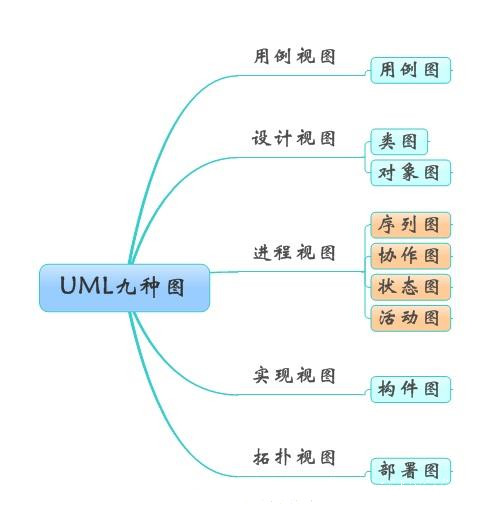 UML中的图其实不止九种 (相同的图还可能会有不同的名称), 这里的九种图是被普遍认可的基础图, 分别为:用例图、类图、对象图、状态图、构件图、部署图、协作图、交互序列图、活动图。