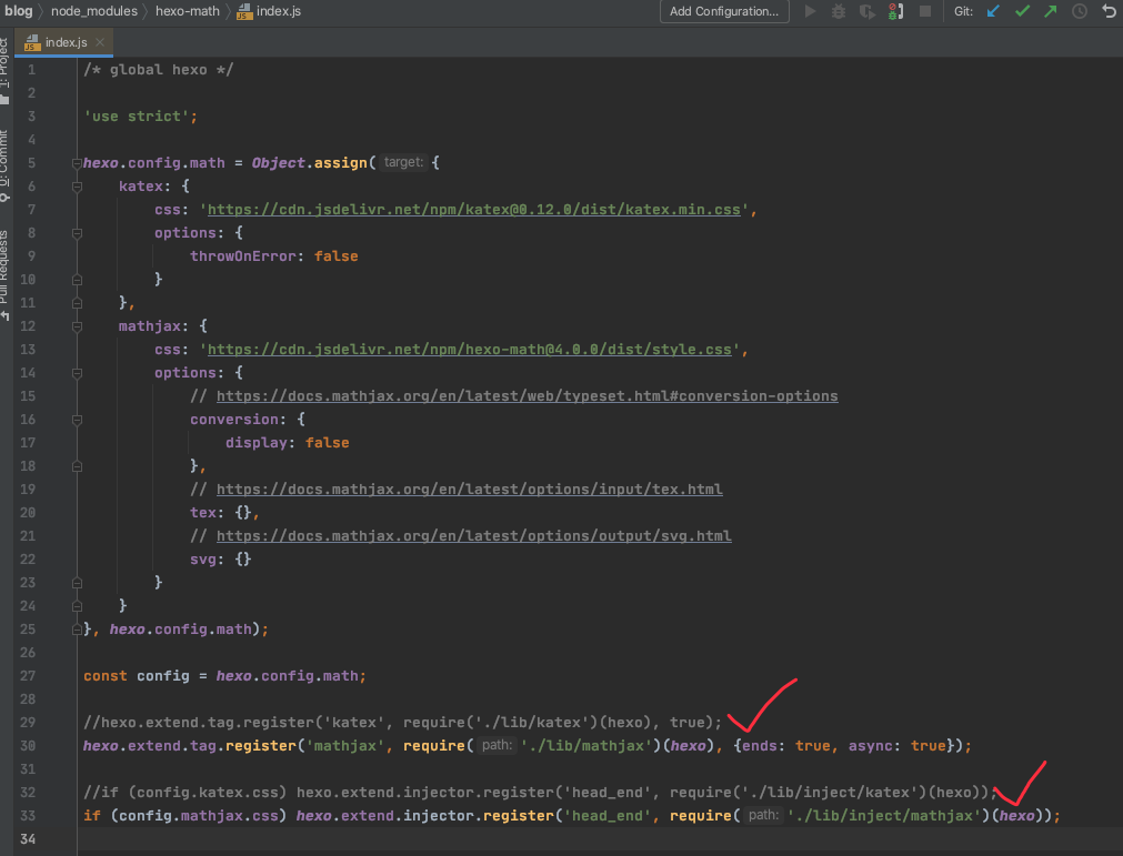 另外,将 node_modules/hexo-math/index.js文件中, 与katex相关的两行注释掉(因为使用了mathjax,没有用katex)