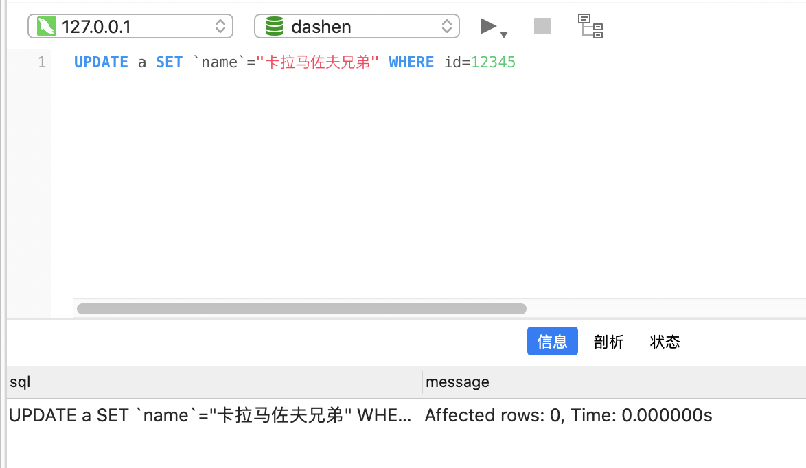 UPDATE a SET name="卡拉马佐夫兄弟" WHERE id=12345