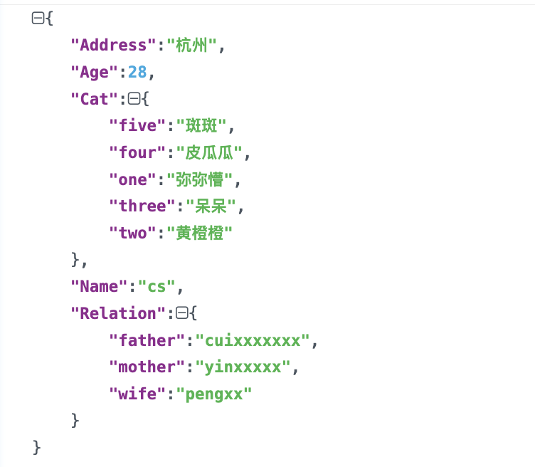 1 2 3 4 err is: <nil > jsonStr is: {"Address" :"杭州" ,"Age" :28 ,"Cat" :{"five" :"斑斑" ,"four" :"皮瓜瓜" ,"one" :"弥弥懵" ,"three" :"呆呆" ,"two" :"黄橙橙" },"Name" :"cs" ,"Relation" :{"father" :"cuixxxxxxx" ,"mother" :"yinxxxxx" ,"wife" :"pengxx" }}