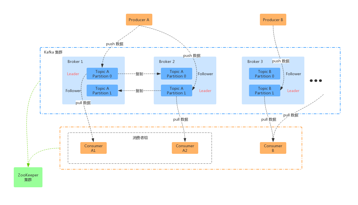 复制:Kafka 通过多个副本的方式来确保消息的可靠性。每个分区都可以配置多个副本,一个分区的副本分布在不同的 broker 上,如果一个 broker 故障,其他 broker 上的副本可以继续提供服务。Kafka 的副本同步策略有三种,分别是全部同步、一半同步、异步。