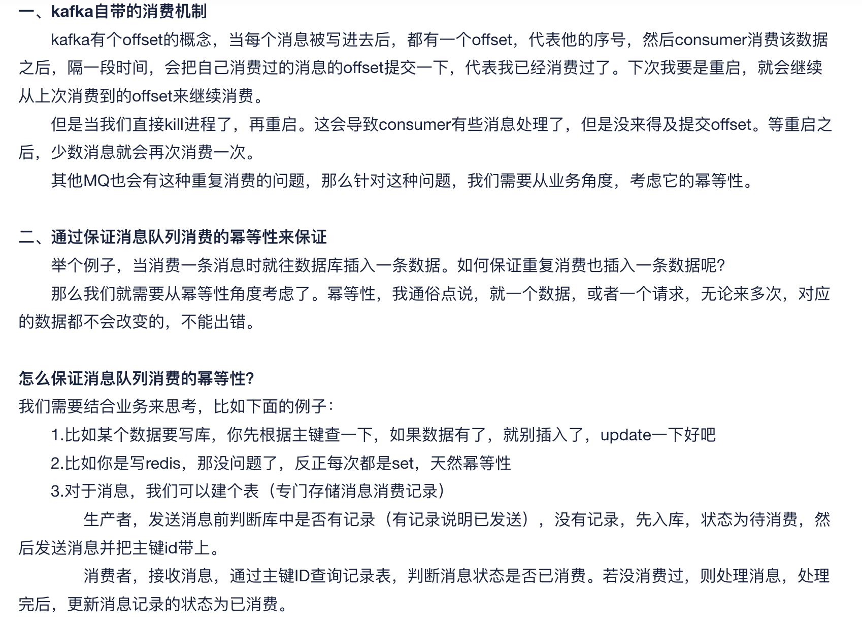 另外,消费者还可以根据消息的唯一标识符来判断消息是否已经被消费过,例如,在消费消息时将消息的唯一标识符存储在数据库中,每次消费消息时先查询数据库中是否已经消费过该消息。但是这种方式需要额外的存储开销,并且需要保证消息的唯一标识符不重复。