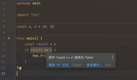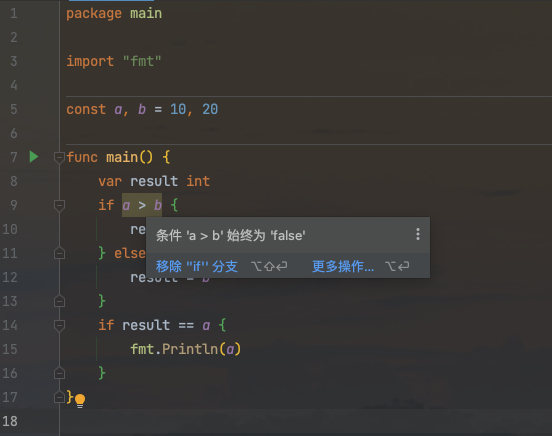 因为 a和b是常量, 永远有a<b, 编译器可以在编译时证明该分支永远不会为true, 因此编译器可以进一步优化代码为: