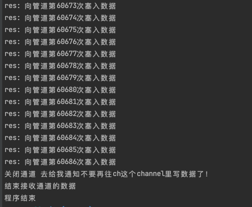1 2 3 4 5 6 7 8 9 10 11 12 13 14 15 16 17 18 19 20 21 22 23 24 25 26 27 28 29 30 31 32 33 34 35 36 37 38 39 40 41 42 43 44 45 46 47 48 49 50 51 52 53 54 55 56 57 58 59 60 61 62 package mainimport ( "fmt" "net/http" _ "net/http/pprof" "sync/atomic" "time" ) func main () { go func () { if err := http.ListenAndServe(":6060" , nil ); err != nil { fmt.Printf("start pprof failed on %s,err%v \n" , "6060" , err) } }() after() fmt.Println("程序结束" ) } func after () { var i int32 ch := make (chan string , 0 ) done := make (chan string ) go func () { for { select { default : atomic.AddInt32(&i, 1 ) ch <- fmt.Sprintf("%s%d%s" , "向管道第" , i, "次塞入数据" ) case exit := <-done: fmt.Println("关闭通道" , exit) return } } }() go func () { time.Sleep(time.Second) done <- "去给我通知不要再往ch这个channel里写数据了!" }() for { select { case res := <-ch: fmt.Println("res:" , res) case <-time.After(2 * time.Second): fmt.Println("结束接收通道的数据" ) return } } }
