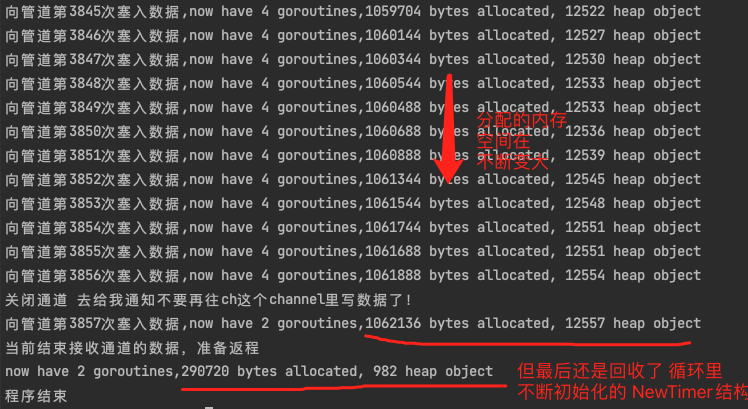 1 2 3 4 5 6 7 8 9 10 11 12 13 14 15 16 17 18 19 20 21 22 23 24 25 26 27 28 29 30 31 32 33 34 35 36 37 38 39 40 41 42 43 44 45 46 47 48 49 50 51 52 53 54 55 56 57 58 59 60 61 62 63 64 65 66 67 68 69 70 71 72 package mainimport ( "fmt" "net/http" _ "net/http/pprof" "runtime" "sync/atomic" "time" ) func main () { go func () { if err := http.ListenAndServe(":6060" , nil ); err != nil { fmt.Printf("start pprof failed on %s,err%v \n" , "6060" , err) } }() after() fmt.Println("程序结束" ) } func after () { var ms runtime.MemStats runtime.ReadMemStats(&ms) fmt.Println("before, have" , runtime.NumGoroutine(), "goroutines," , ms.Alloc, "bytes allocated" , ms.HeapObjects, "heap object" ) var i int32 ch := make (chan string , 0 ) done := make (chan string ) go func () { for { select { default : atomic.AddInt32(&i, 1 ) ch <- fmt.Sprintf("%s%d%s" , "向管道第" , i, "次塞入数据" ) case exit := <-done: fmt.Println("关闭通道" , exit) return } } }() go func () { time.Sleep(time.Second) done <- "去给我通知不要再往ch这个channel里写数据了!" }() for { select { case res := <-ch: runtime.GC() runtime.ReadMemStats(&ms) fmt.Printf("%s,now have %d goroutines,%d bytes allocated, %d heap object \n" , res, runtime.NumGoroutine(), ms.Alloc, ms.HeapObjects) case <-time.After(2 * time.Second): runtime.GC() fmt.Println("当前结束接收通道的数据,准备返程" ) runtime.ReadMemStats(&ms) fmt.Printf("now have %d goroutines,%d bytes allocated, %d heap object \n" , runtime.NumGoroutine(), ms.Alloc, ms.HeapObjects) return } } }