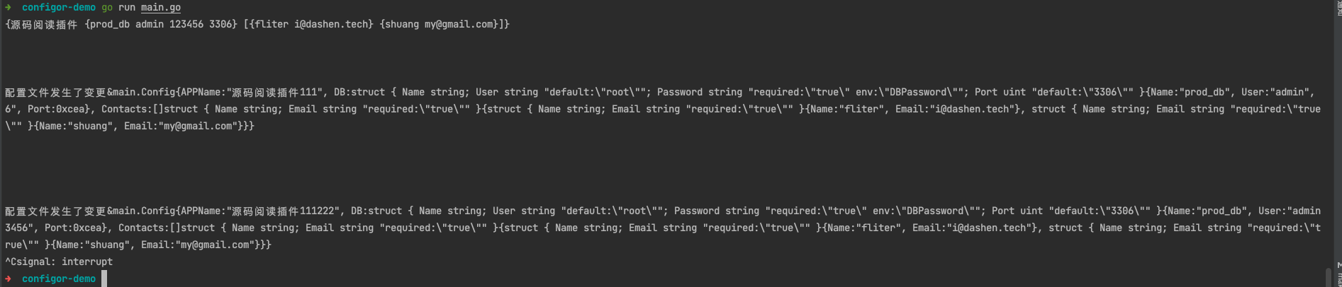 也可以通过环境变量开启,如 CONFIGOR_DEBUG_MODE=true go run main.go