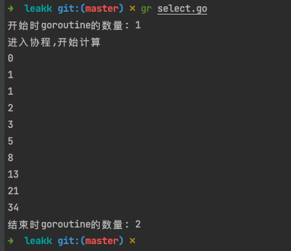 1 2 3 4 5 6 7 8 9 10 11 12 13 14 15 16 17 18 19 20 21 22 23 24 25 26 27 28 29 30 31 32 33 34 35 36 37 38 39 40 41 42 43 package mainimport ( "fmt" "runtime" "time" ) func fibonacci (c chan int ) { fmt.Println("进入协程,开始计算" ) x, y := 0 , 1 for { select { case c <- x: x, y = y, x+y } } } func deal4 () { c := make (chan int ) go fibonacci(c) for i := 0 ; i < 10 ; i++ { fmt.Println(<-c) } } func main () { fmt.Println("开始时goroutine的数量:" , runtime.NumGoroutine()) deal4() time.Sleep(3e9 ) fmt.Println("结束时goroutine的数量:" , runtime.NumGoroutine()) }