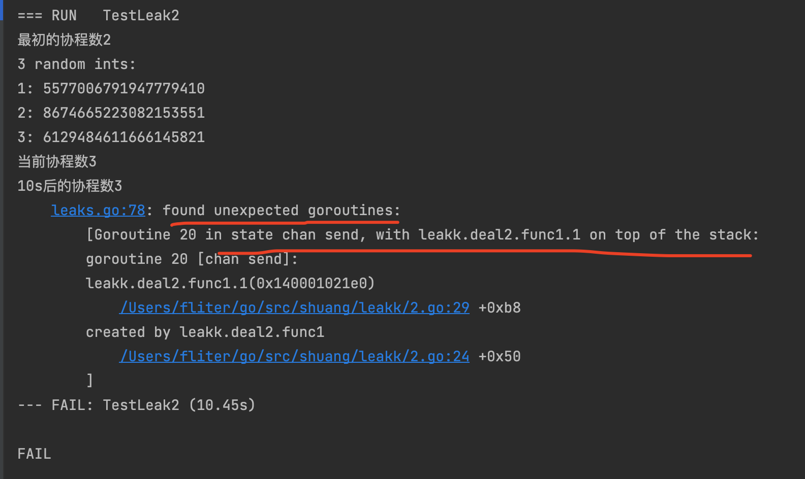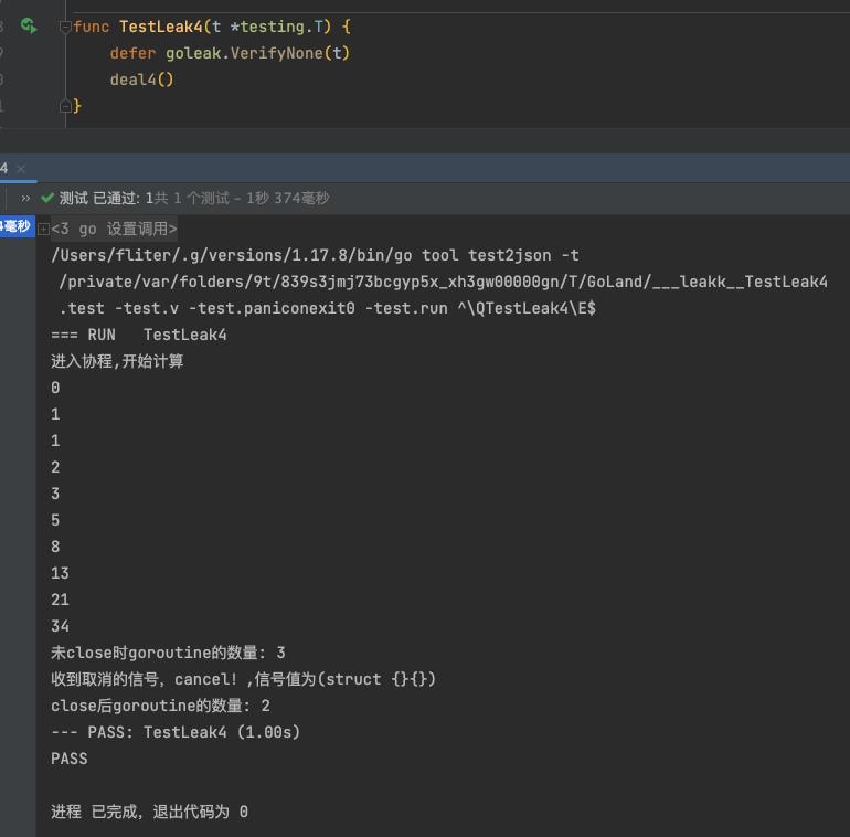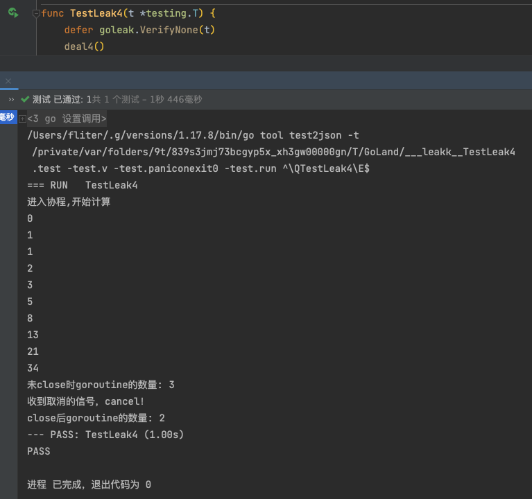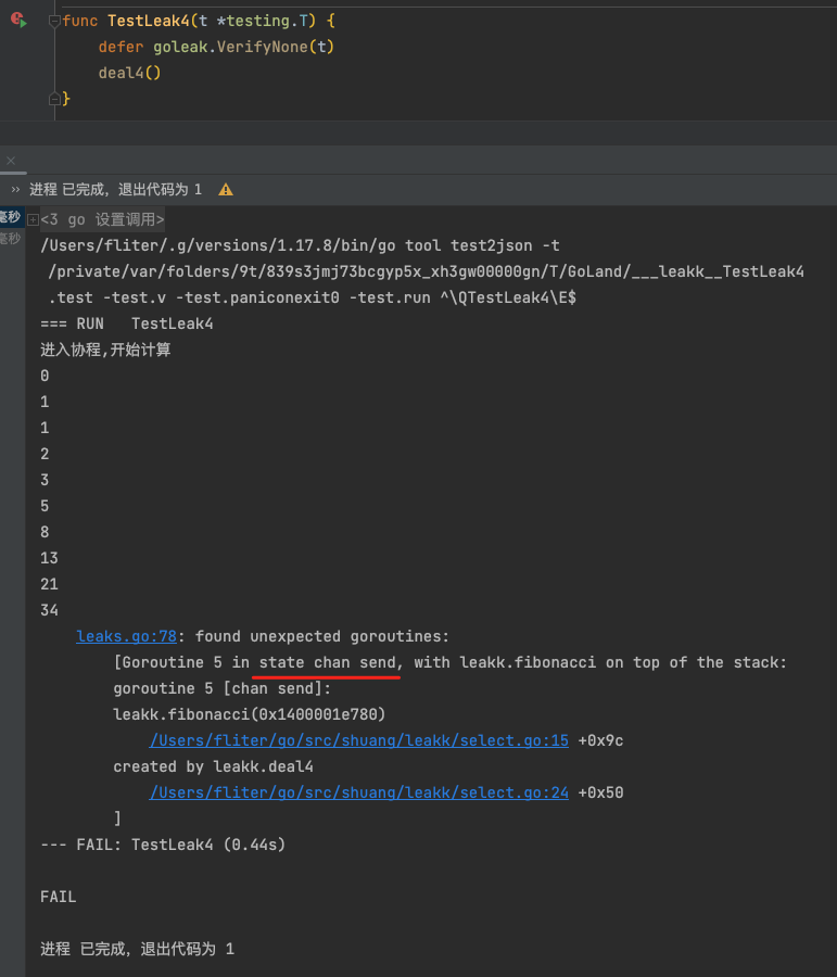 1 2 3 4 func TestLeak2 (t *testing.T) { defer goleak.VerifyNone(t) deal2() }