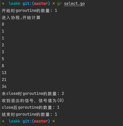 1 2 3 4 5 6 7 8 9 10 11 12 13 14 15 16 17 18 19 20 21 22 23 24 25 26 27 28 29 30 31 32 33 34 35 36 37 38 39 40 41 42 43 44 45 46 47 48 49 50 51 52 53 54 55 package mainimport ( "fmt" "runtime" "time" ) func fibonacci (c, quit chan int ) { fmt.Println("进入协程,开始计算" ) x, y := 0 , 1 for { select { case c <- x: x, y = y, x+y case <-quit: fmt.Printf("收到退出的信号,信号值为(%d)\n" , <-quit) return } } } func deal4 () { c := make (chan int ) quit := make (chan int ) go fibonacci(c, quit) for i := 0 ; i < 10 ; i++ { fmt.Println(<-c) } fmt.Println("未close时goroutine的数量:" , runtime.NumGoroutine()) close (quit) time.Sleep(1e9 ) fmt.Println("close后goroutine的数量:" , runtime.NumGoroutine()) } func main () { fmt.Println("开始时goroutine的数量:" , runtime.NumGoroutine()) deal4() time.Sleep(3e9 ) fmt.Println("结束时goroutine的数量:" , runtime.NumGoroutine()) }