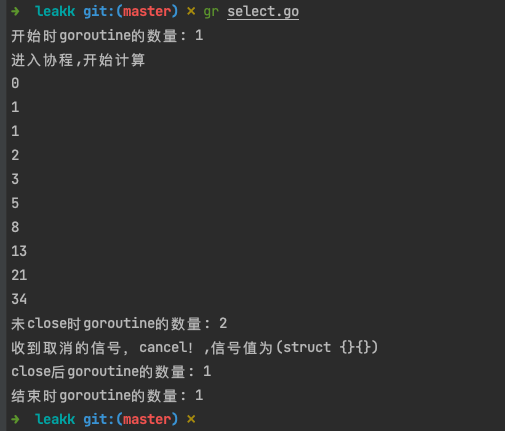 1 2 3 4 5 6 7 8 9 10 11 12 13 14 15 16 17 18 19 20 21 22 23 24 25 26 27 28 29 30 31 32 33 34 35 36 37 38 39 40 41 42 43 44 45 46 47 48 49 50 51 52 53 54 55 56 57 58 package mainimport ( "context" "fmt" "runtime" "time" ) func fibonacci (c chan int , ctx context.Context) { fmt.Println("进入协程,开始计算" ) x, y := 0 , 1 for { select { case c <- x: x, y = y, x+y case <-ctx.Done(): fmt.Printf("收到取消的信号,cancel!,信号值为(%#v)\n" , <-ctx.Done()) return } } } func deal4 () { ctx, cancel := context.WithCancel(context.Background()) defer cancel() c := make (chan int ) go fibonacci(c, ctx) for i := 0 ; i < 10 ; i++ { fmt.Println(<-c) } fmt.Println("未close时goroutine的数量:" , runtime.NumGoroutine()) cancel() time.Sleep(1e9 ) fmt.Println("close后goroutine的数量:" , runtime.NumGoroutine()) } func main () { fmt.Println("开始时goroutine的数量:" , runtime.NumGoroutine()) deal4() time.Sleep(3e9 ) fmt.Println("结束时goroutine的数量:" , runtime.NumGoroutine()) }