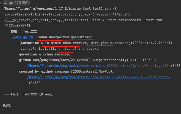 在项目中引入了ants,用goleak检测发现有内存泄露