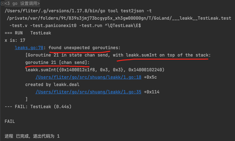 1 2 3 4 5 6 7 8 9 10 11 package mainimport ( "go.uber.org/goleak" "testing" ) func TestLeak (t *testing.T) { defer goleak.VerifyNone(t) deal() }