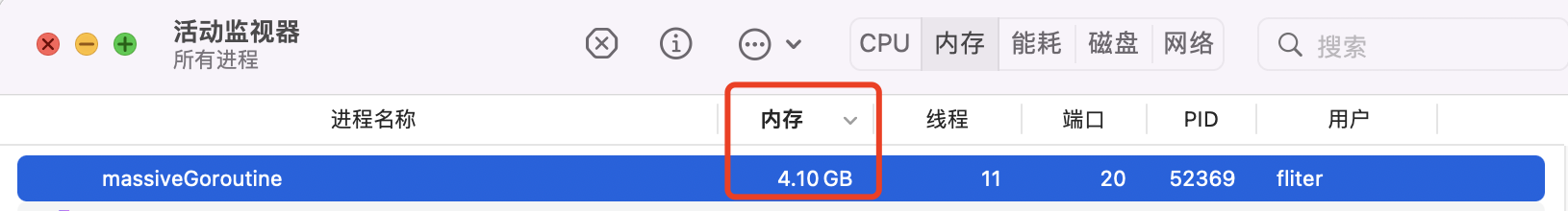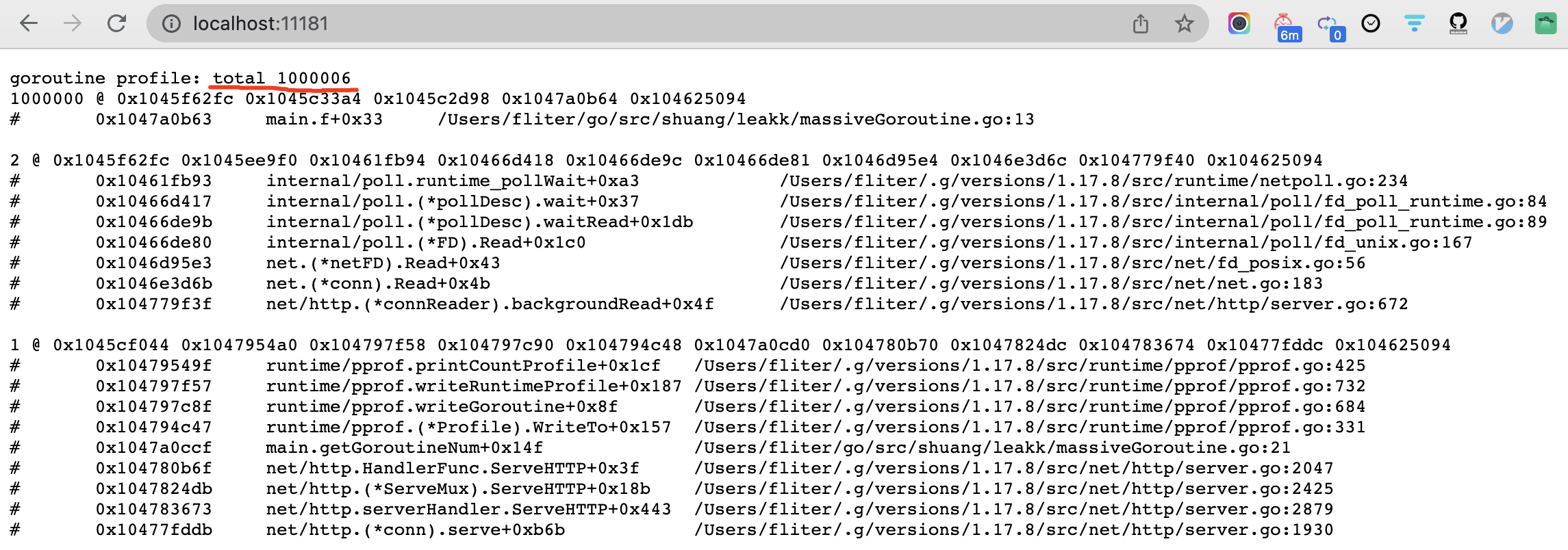 1 2 3 4 5 6 7 8 9 10 11 12 13 14 15 16 17 18 19 20 21 22 23 24 25 26 27 28 29 30 31 32 33 34 35 36 37 38 package mainimport ( "net/http" "runtime/pprof" ) var quit chan struct {} = make (chan struct {})func f () { <-quit } func getGoroutineNum (w http.ResponseWriter, r *http.Request) { w.Header().Set("Content-Type" , "text/plain" ) p := pprof.Lookup("goroutine" ) p.WriteTo(w, 1 ) } func deal0 () { for i := 0 ; i < 100_0000 ; i++ { go f() } http.HandleFunc("/" , getGoroutineNum) http.ListenAndServe(":11181" , nil ) } func main () { deal0() }