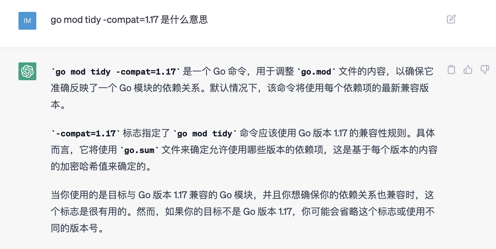 -compat=1.17 标志指定了 go mod tidy 命令应该使用 Go 版本 1.17 的兼容性规则。具体而言,它将使用 go.sum 文件来确定允许使用哪些版本的依赖项,这是基于每个版本的内容的加密哈希值来确定的。